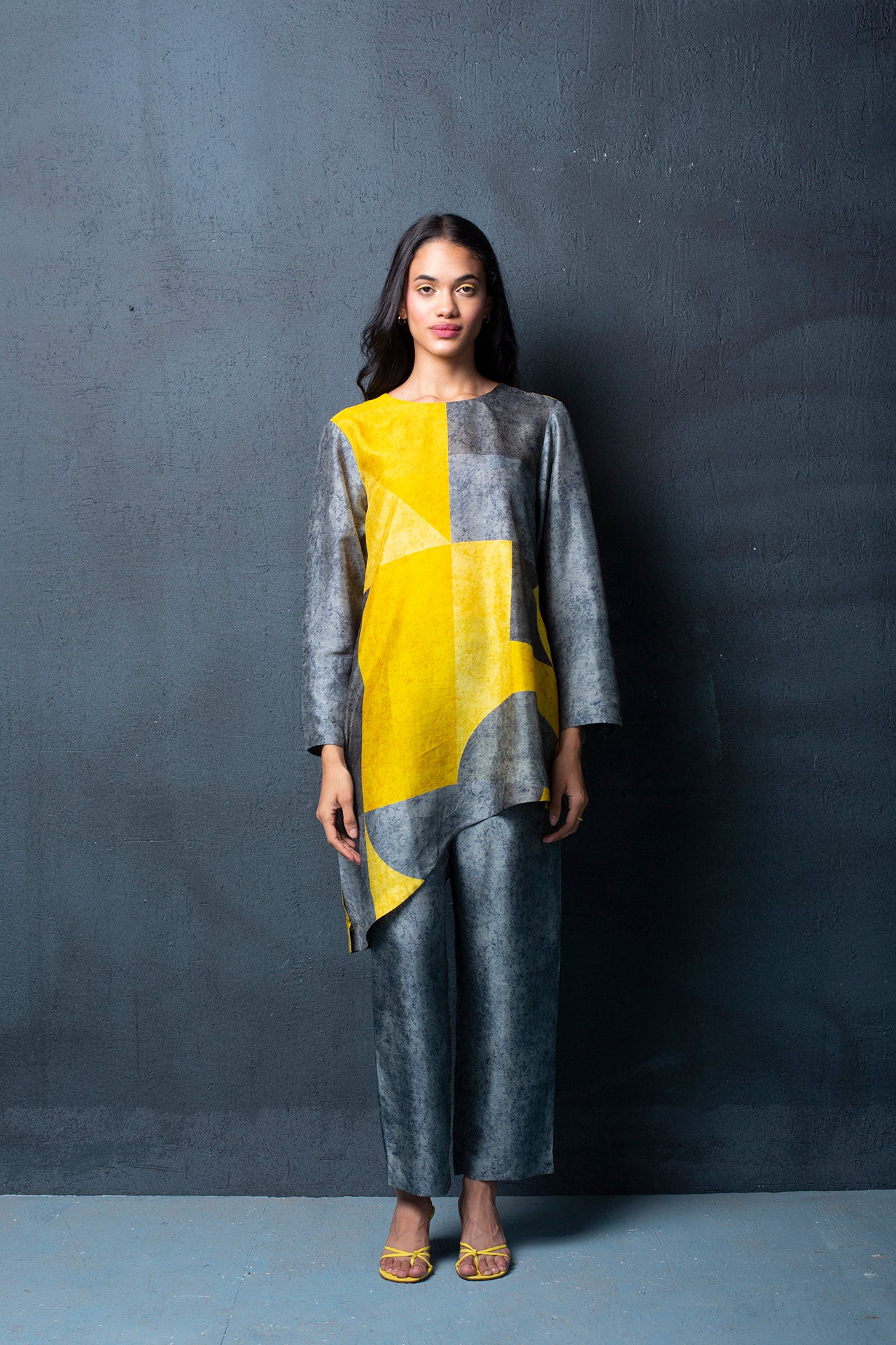 A two piece dupion silk set comprised of geometrical abstract print, asymmetrical hemline and parallel pants with fusion textile play of abstract print.