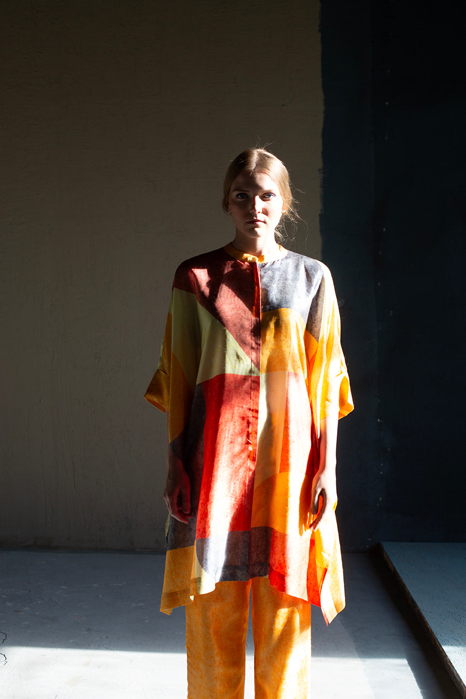A two piece dupion silk set comprised of abstract geometric print with free flowing tunic and parallel pants with fusion textile play of abstract print.