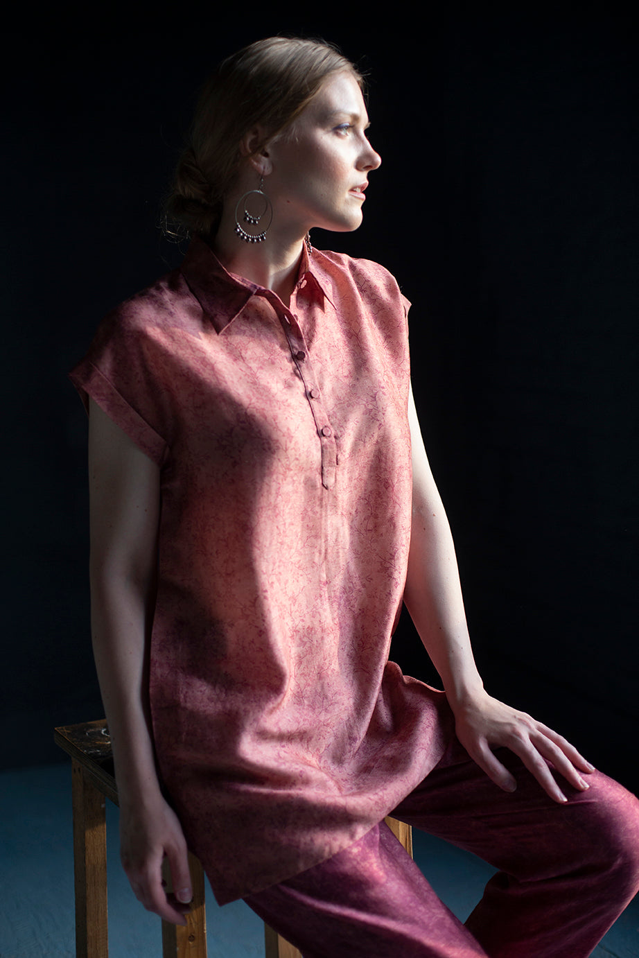 A two piece dupion silk set comprised of miniature floral print with free flowing tunic and parallel pants with fusion textile play of miniature floral print.