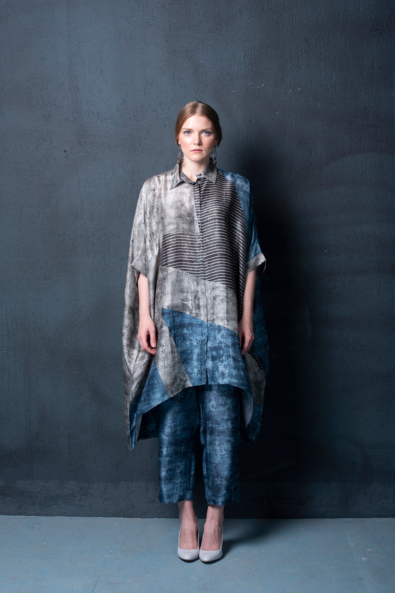 A two piece dupion silk set comprised of abstract geometrical print kurta with high low hemline and parallel pants with fusion textile play of abstract geometrical print.