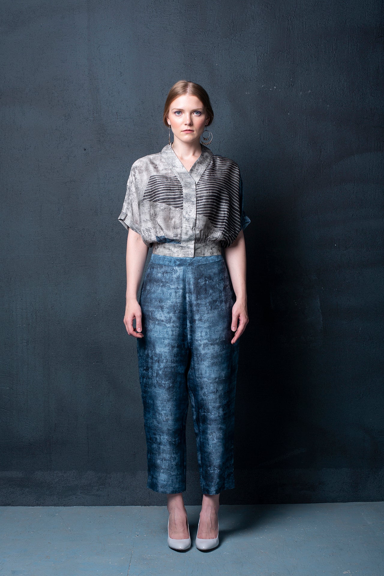 A two piece dupion silk set comprised of abstract geometric print with half and half combination of shirt and kaftan, parallel pants with fusion textile play of abstract geometrical  print.
