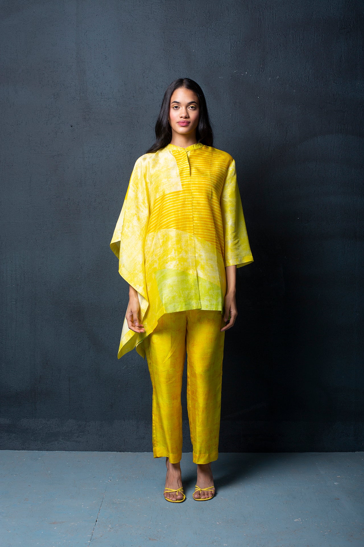 A two piece dupion silk set comprised of abstract geometric print with half and half combination of shirt and kaaftan, parallel pants with fusion textile play of abstract geometrical  print.