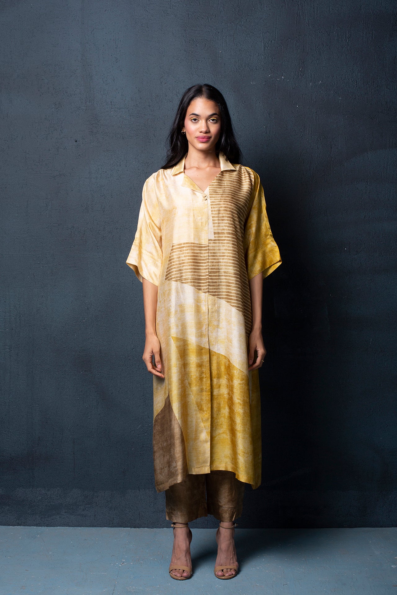 A two piece dupion silk set comprised of half collar, abstract print straight kurta with and parallel pants with fusion textile play of abstract print.