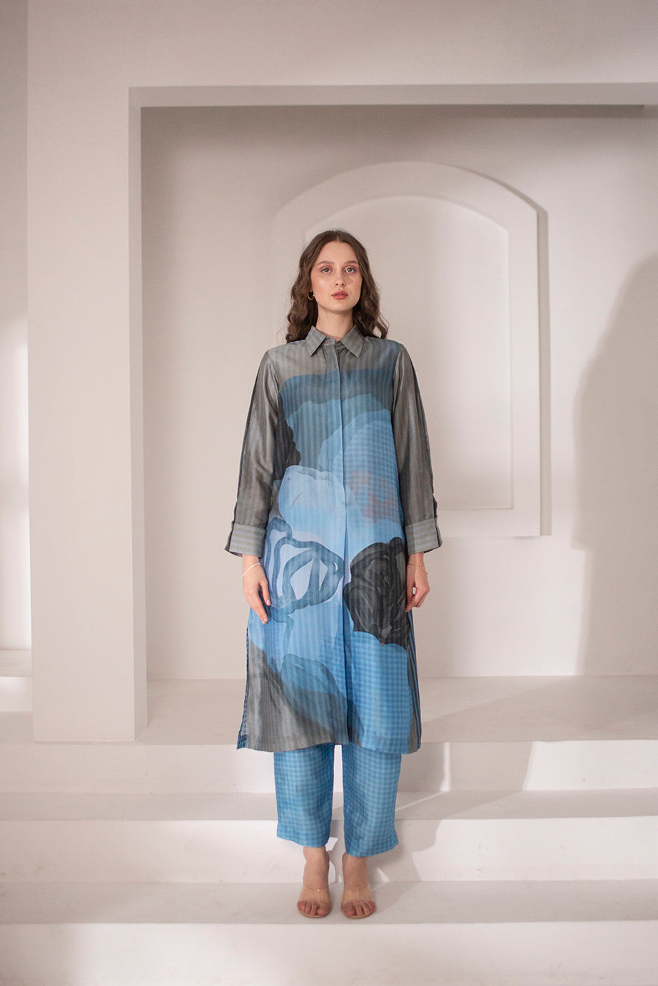 A two piece dupion silk set comprised of abstract geometric and floral print in playful color compositions and parallel pants with fusion textiles.