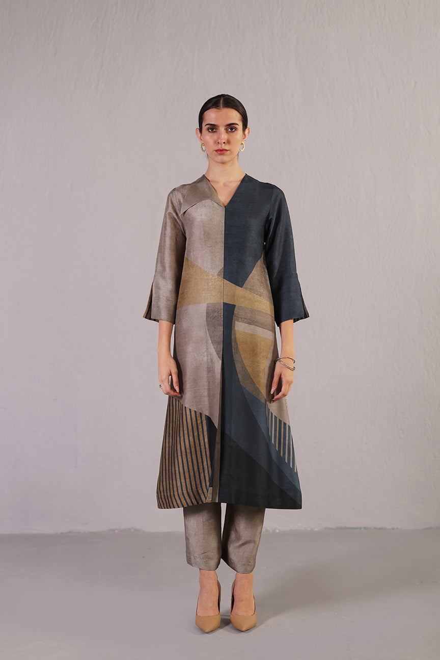 A grey & soft beige long kurta set with a modern one side lapel collar, 3/4 the sleeves & straight pants curated in a soft silk fabric, designed in-house.  Fabric - Dupion Silk Color - Grey & Beige No. of Components - 2 Care - Dry Clean  Delivery - 21...