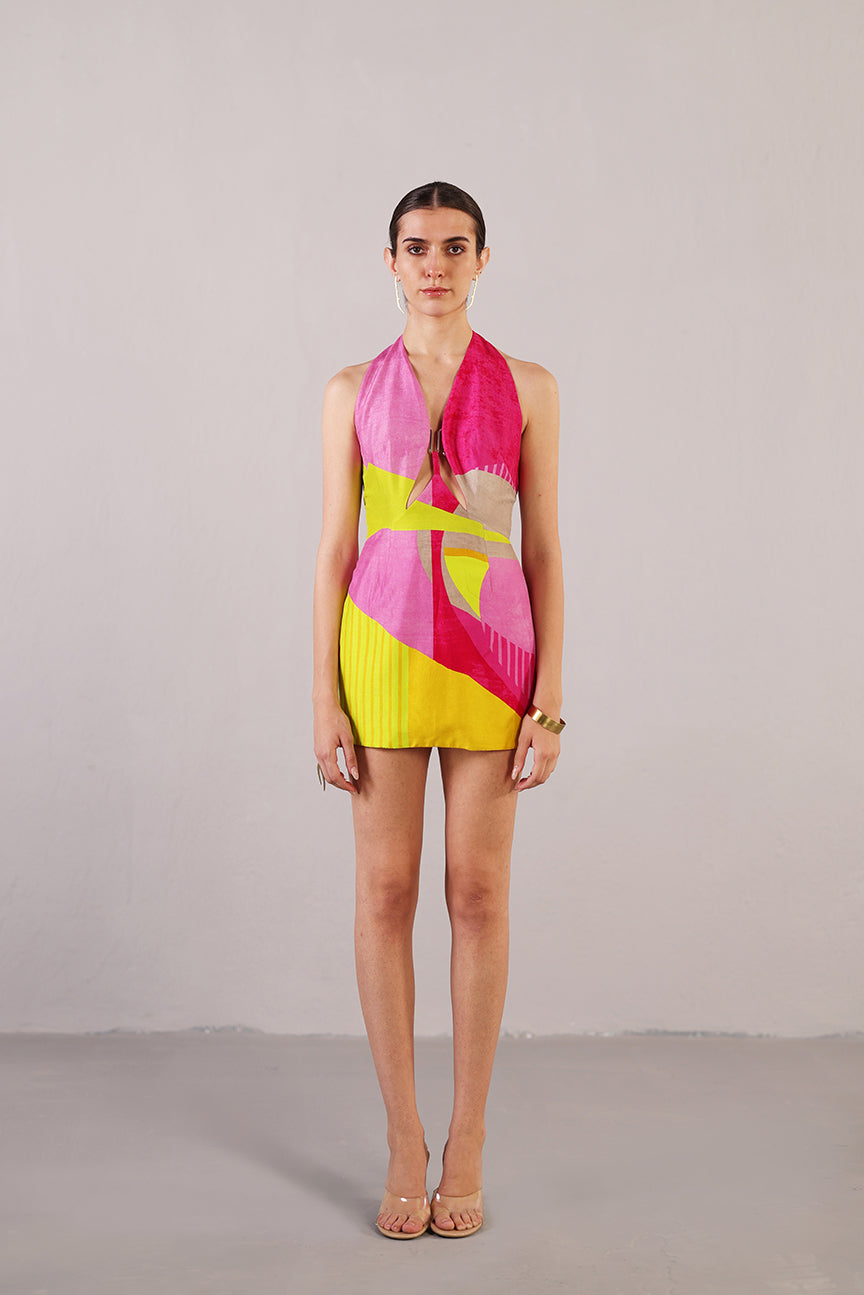 A bright pink & yellow halter dress curated in a soft silk fabric, designed in-house. Fabric - Dupion Silk Color - Pink & Yellow No. of Components - 1 Care - Dry Clean  Delivery - 21 Days