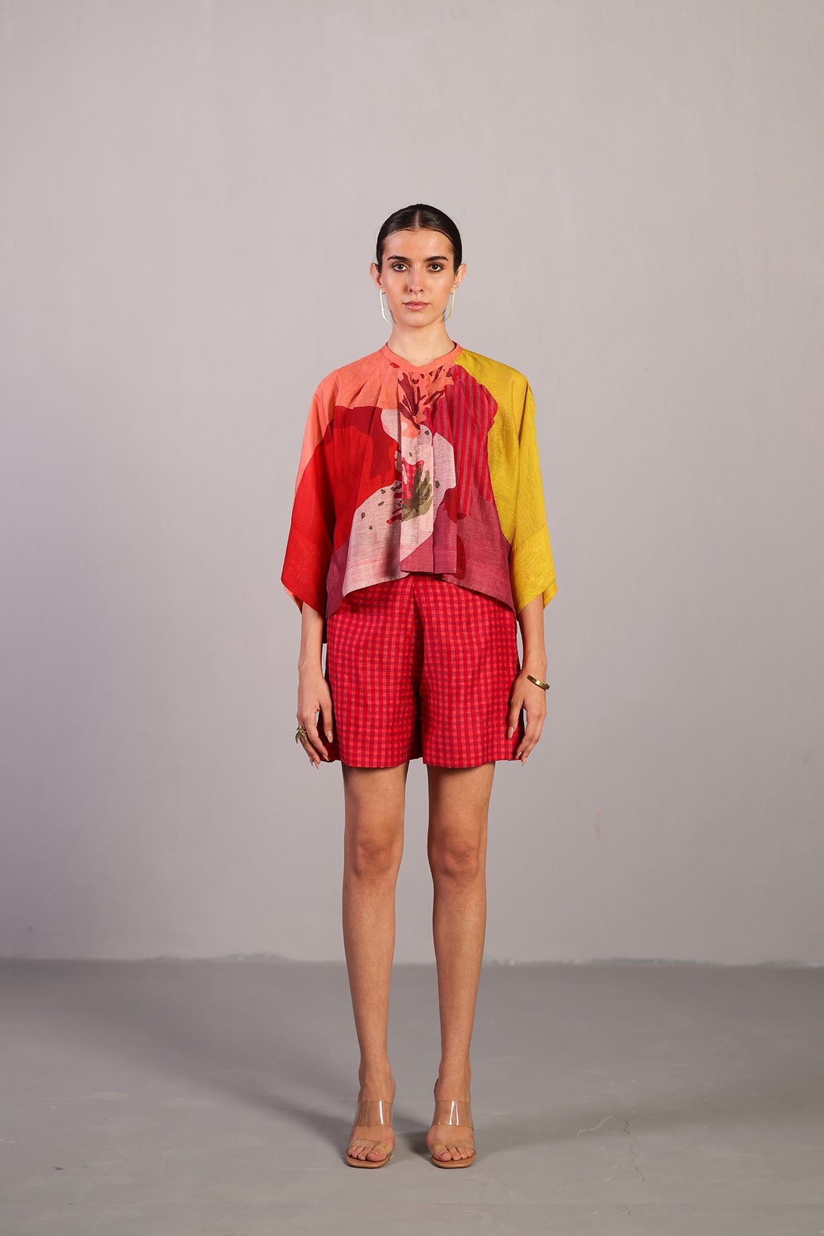 An orange-red co-ord set with long sleeves & a round neck collar alongwith shorts curated in a subtle sheen linen fabric with watercolour brush strokes, designed in-house. Fabric - Linen Silk Color - Orange-Red  No. of Components - 2 Care - Dry Clean  Delivery - 21 Days