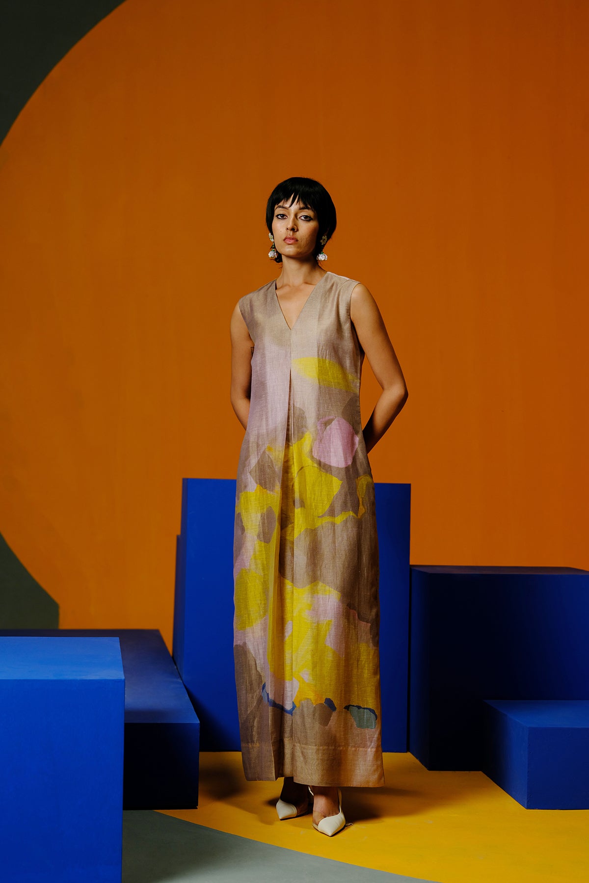 A beige & yellow cut sleeve jumpsuit curated in a subtle sheen linen fabric with watercolour brush strokes, designed in-house. Fabric - Linen Silk Color - Smoky beige & Bright Yellow  No. of Components - 1 Care - Dry Clean  Delivery - 21 Days