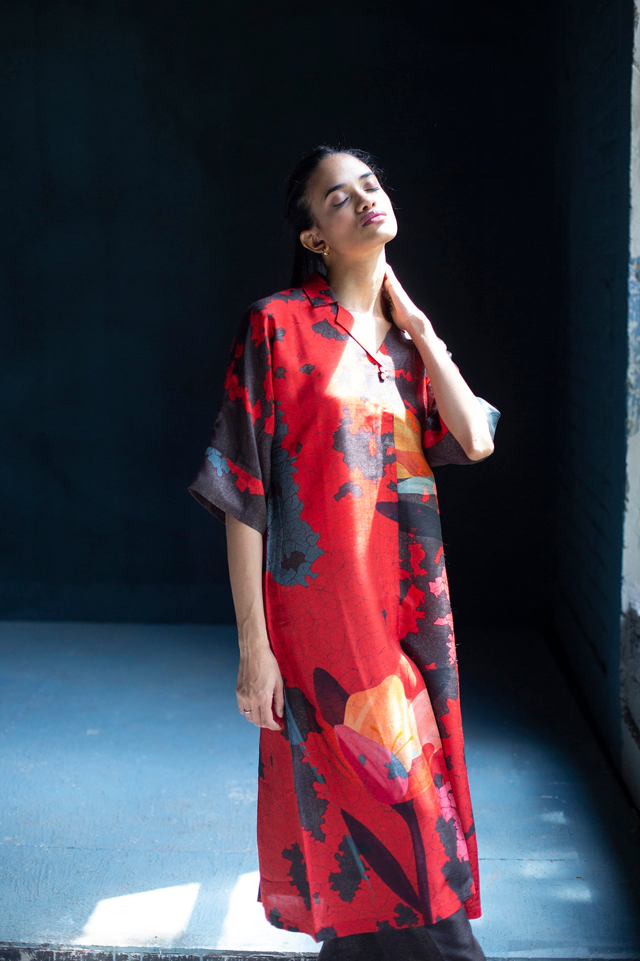 A two piece dupion silk set comprised of half collar, abstract print straight kurta with and parallel pants with fusion textile play of abstract print.