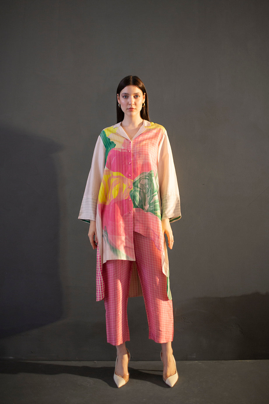 A two piece dupion silk set comprised of abstract geometric and floral print in playful color compositions and parallel pants with fusion textiles.