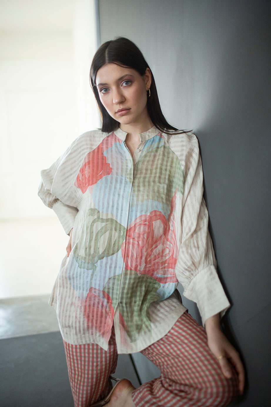 A two piece handloom weave set comprised of abstract geometric and floral print in playful color compositions and parallel pants with fusion textiles.