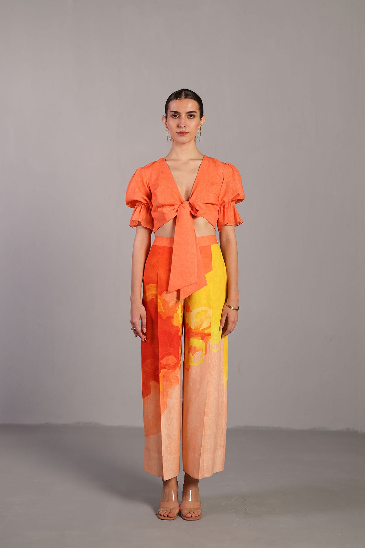 An orange co-ord set comprising of a front-knot blouse & printed pants curated in airy linen with a painterly application of colour, designed in-house. Fabric - Korean Linen Color - Bright Orange & Yellow No. of Components - 2 Care - Dry Clean  Delivery - 21 Days