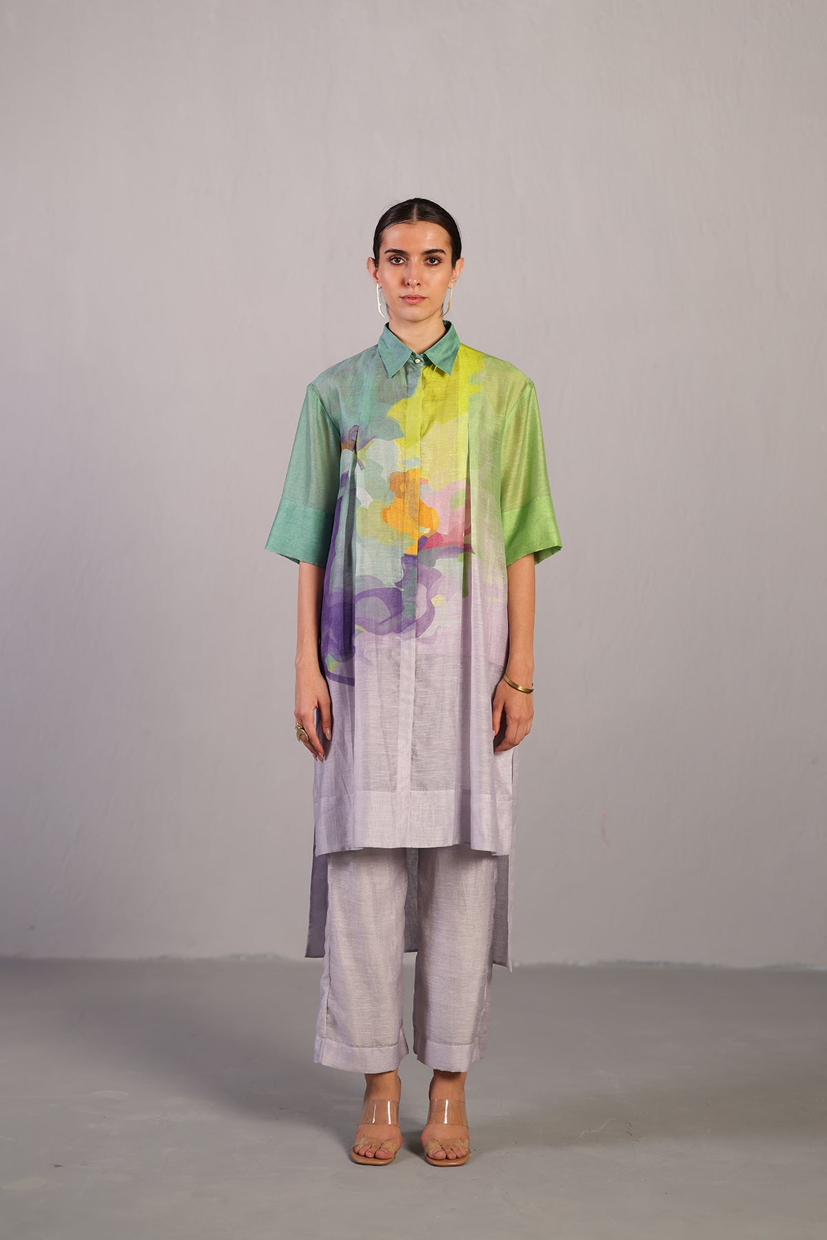 A neon blue & green high-low kurta set with front pleats, a point collar along with straight pants curated in a subtle sheen linen fabric with water colour brush strokes, designed in-house. "all sizes available. Fabric - Linen Silk Color - Neon Blue & Green No. of Components - 2...