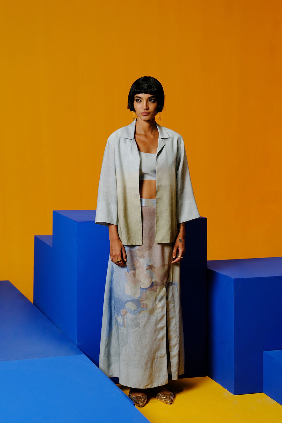 A pastel blue three-piece co-ord set comprising of a full-sleeved jacket, bustier & a long skirt curated in airy linen with a painterly application of colour, designed in-house. Fabric - Korean Linen Color - Pastel Blue & Green    No. of Components - 3 Care - Dry Clean  Delivery -...