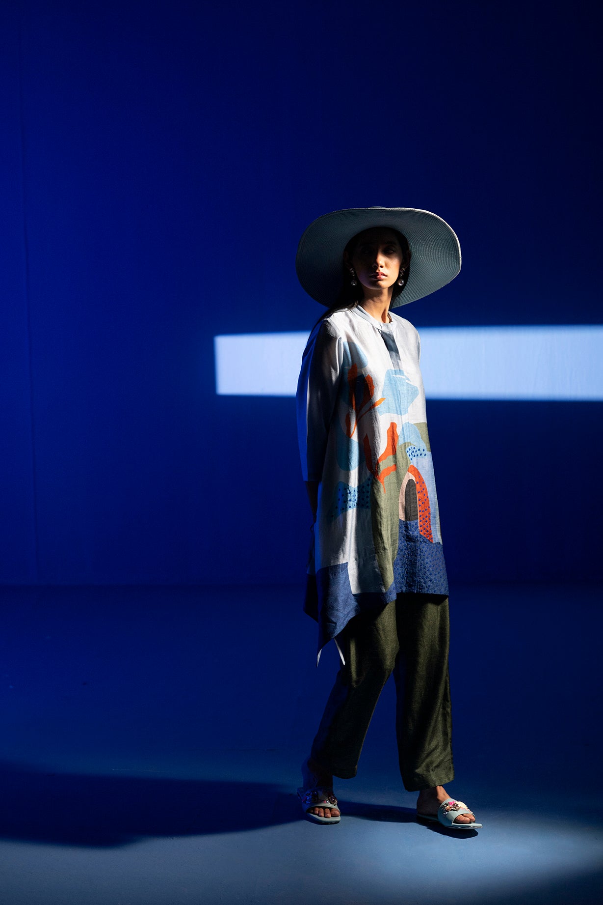 Grandeur silhouette in contemporary print designed in house has tails and is complimented with mandarin collar and 3/4th sleeves.