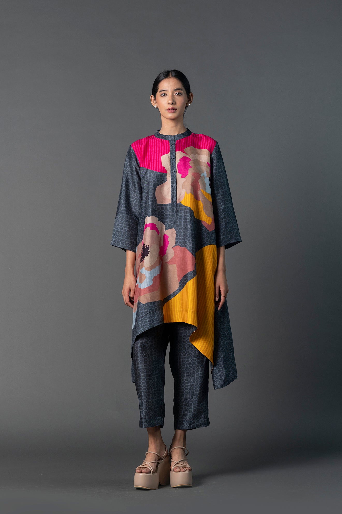 Asymmetric longline cut on one side and usual on the other is complimented with V broad lapel collar and kaftan sleeves paired with pants.