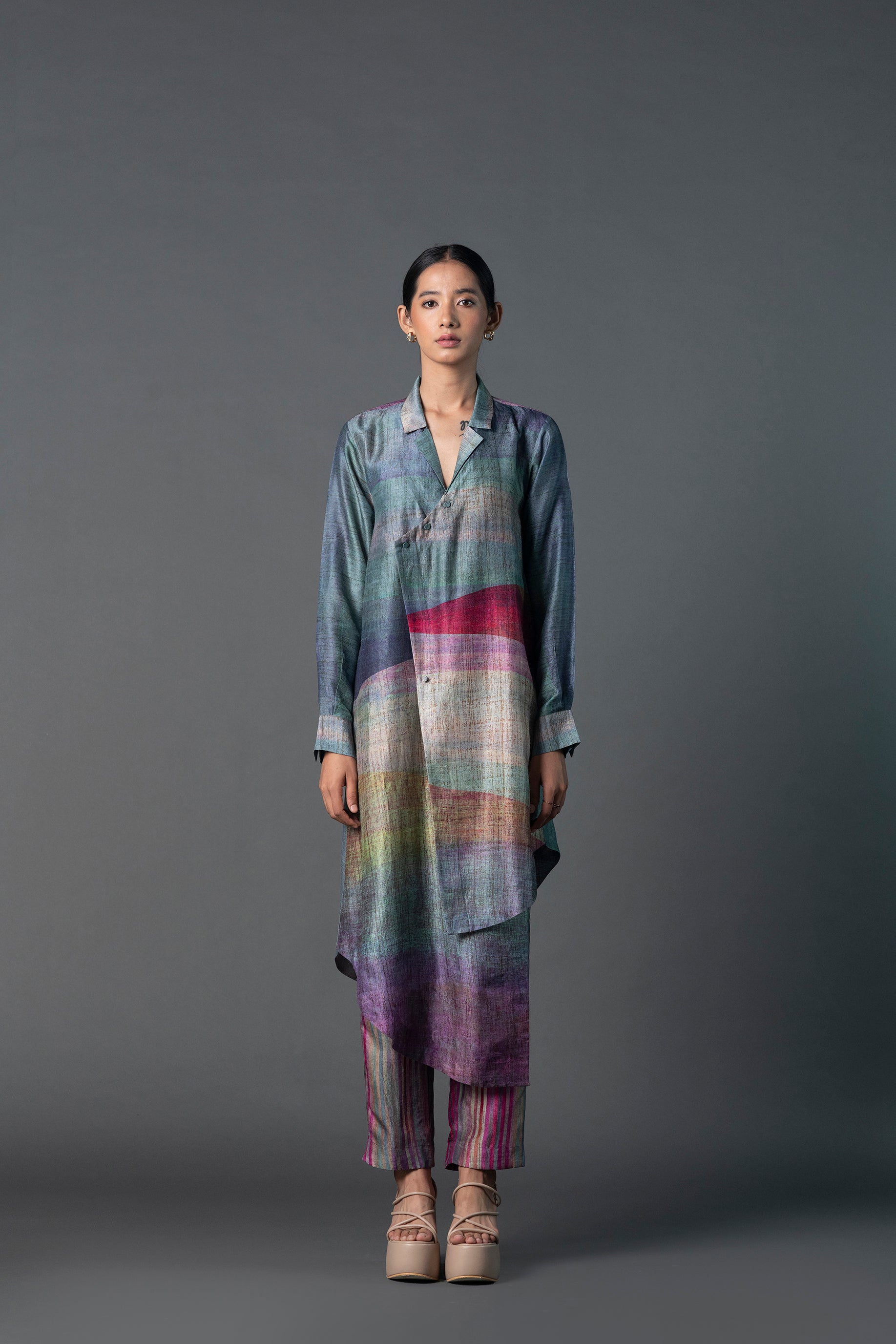 Indie vogue ! The set comprises of an asymmetric tunic with length solid color pleats one side accompanied by contemporary print palla the other side paired with pants.