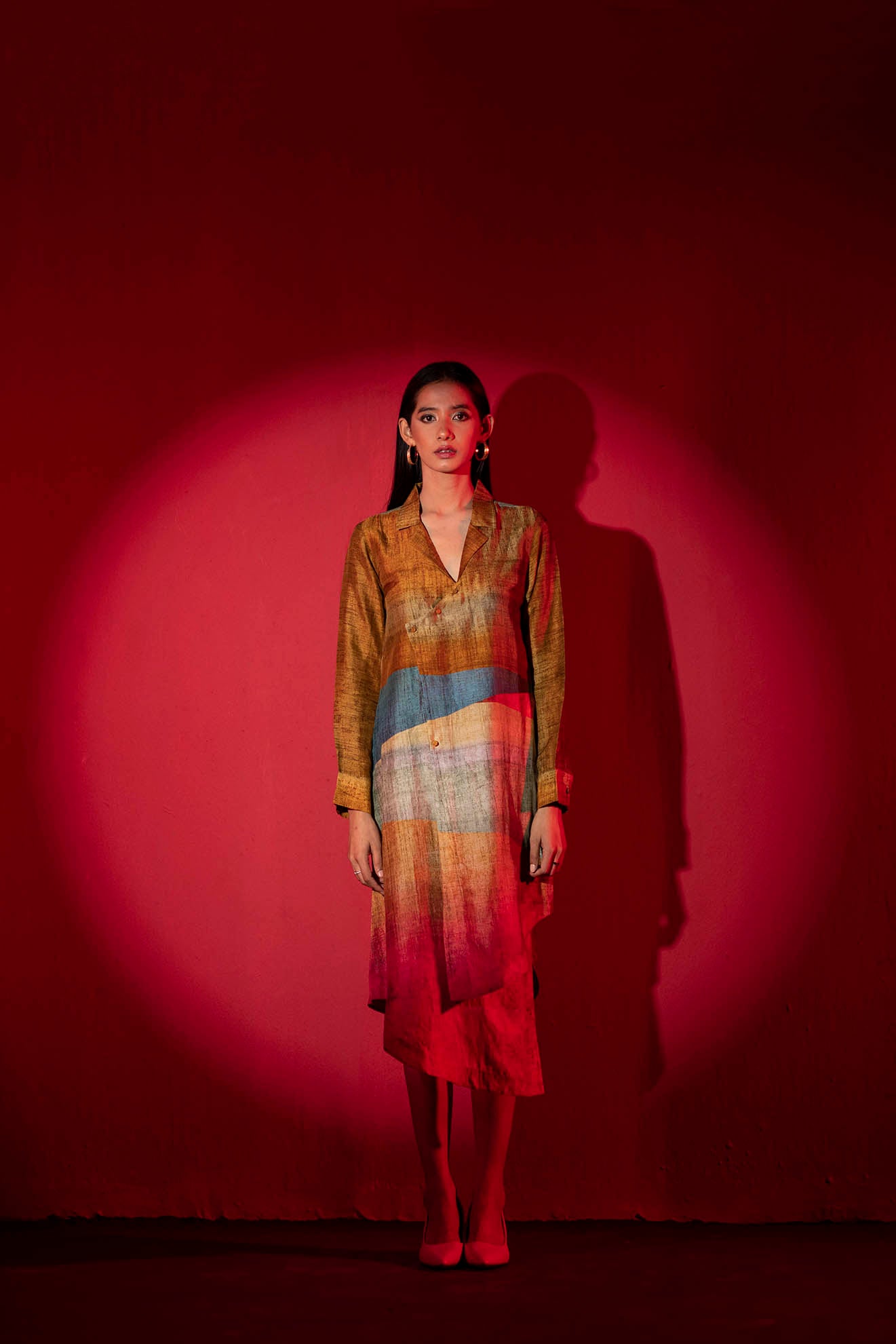 Indie vogue ! The set comprises of an asymmetric tunic with length solid color pleats one side accompanied by contemporary print palla the other side paired with pants.