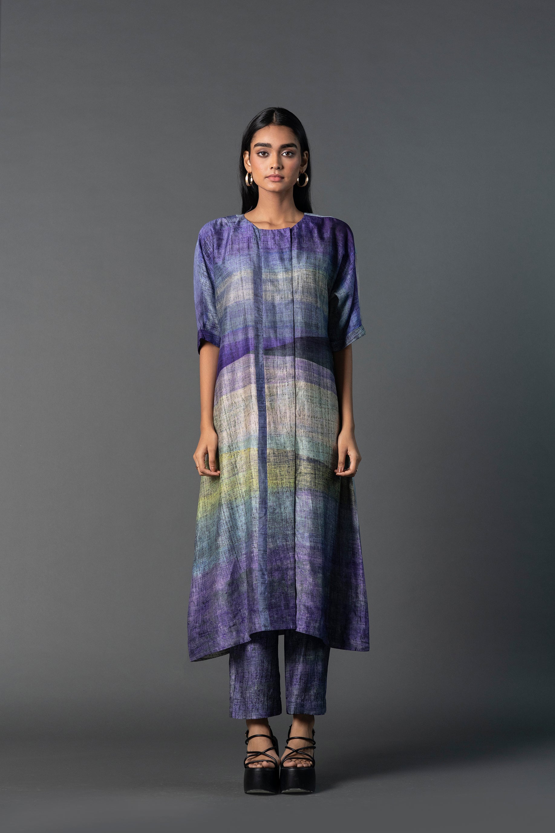 A classic silhouette never goes out of style! Straight round neck kurta with ombre print designed in-house and paneled length lapel paired with pants.