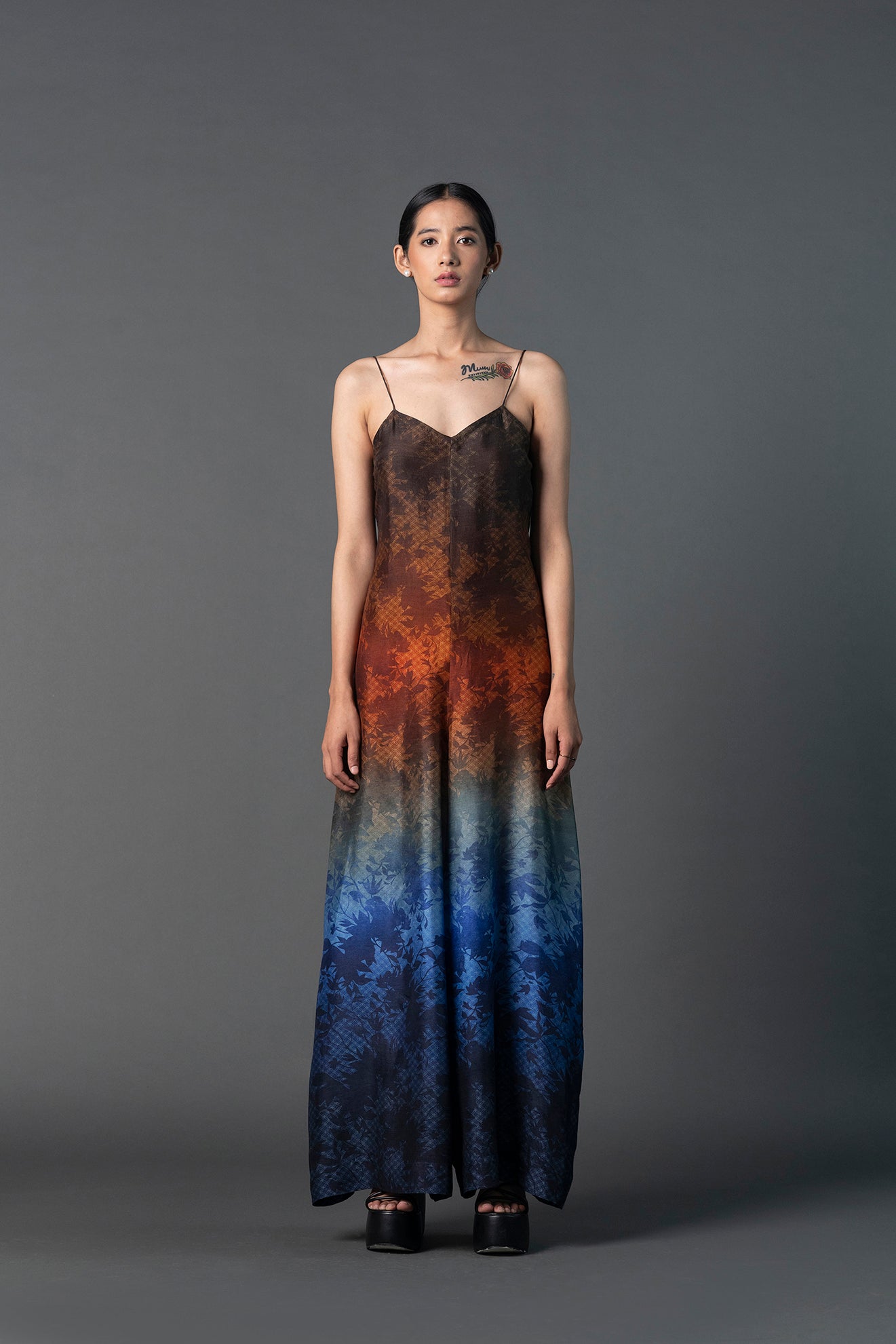 Noodle strap pret comfort fit jumpsuit with autumn print designed in-house.
