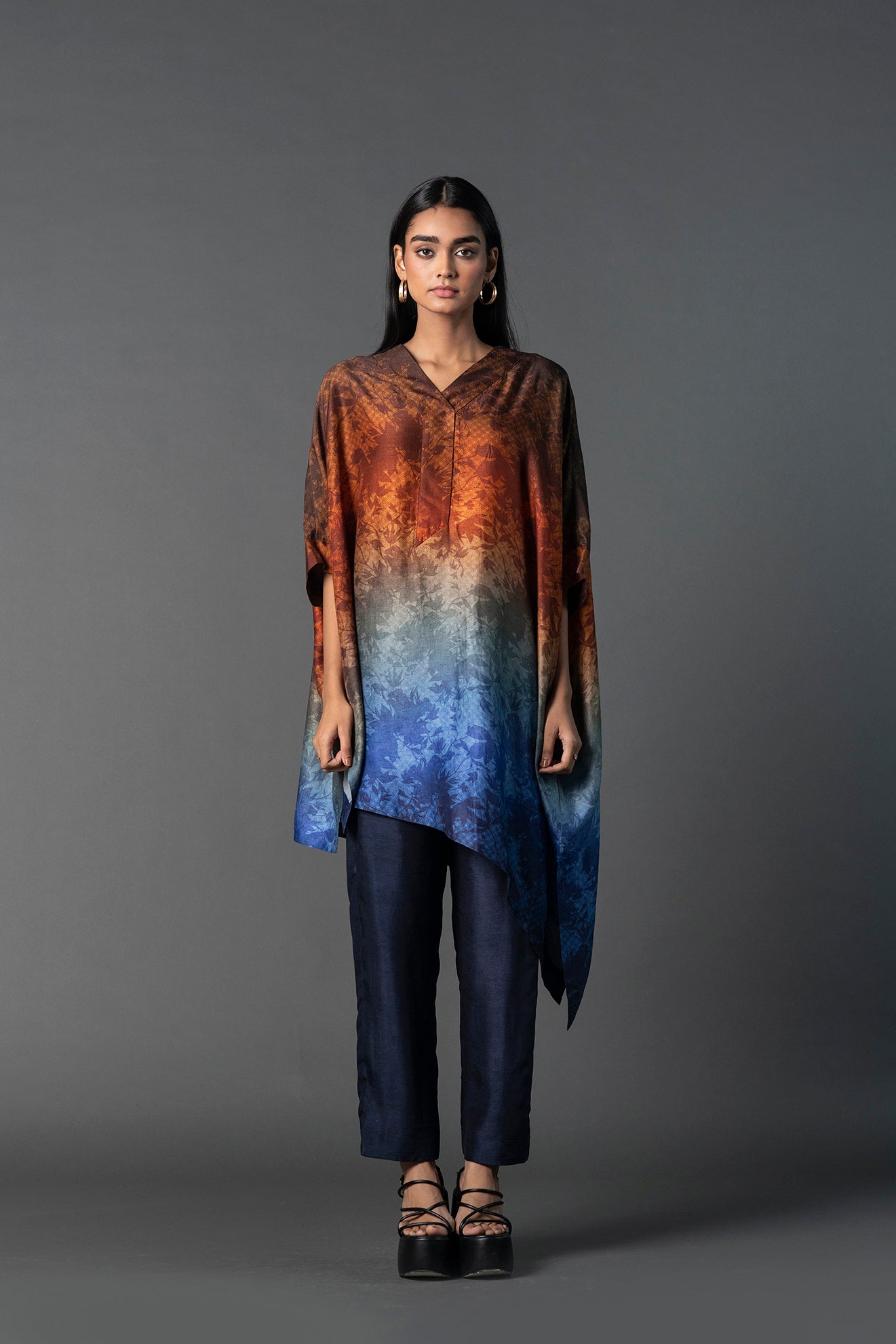 Asymmetric longline cut on one side and usual on the other is complimented with V neck shirt pattern and 3/4th sleeves paired with pants.