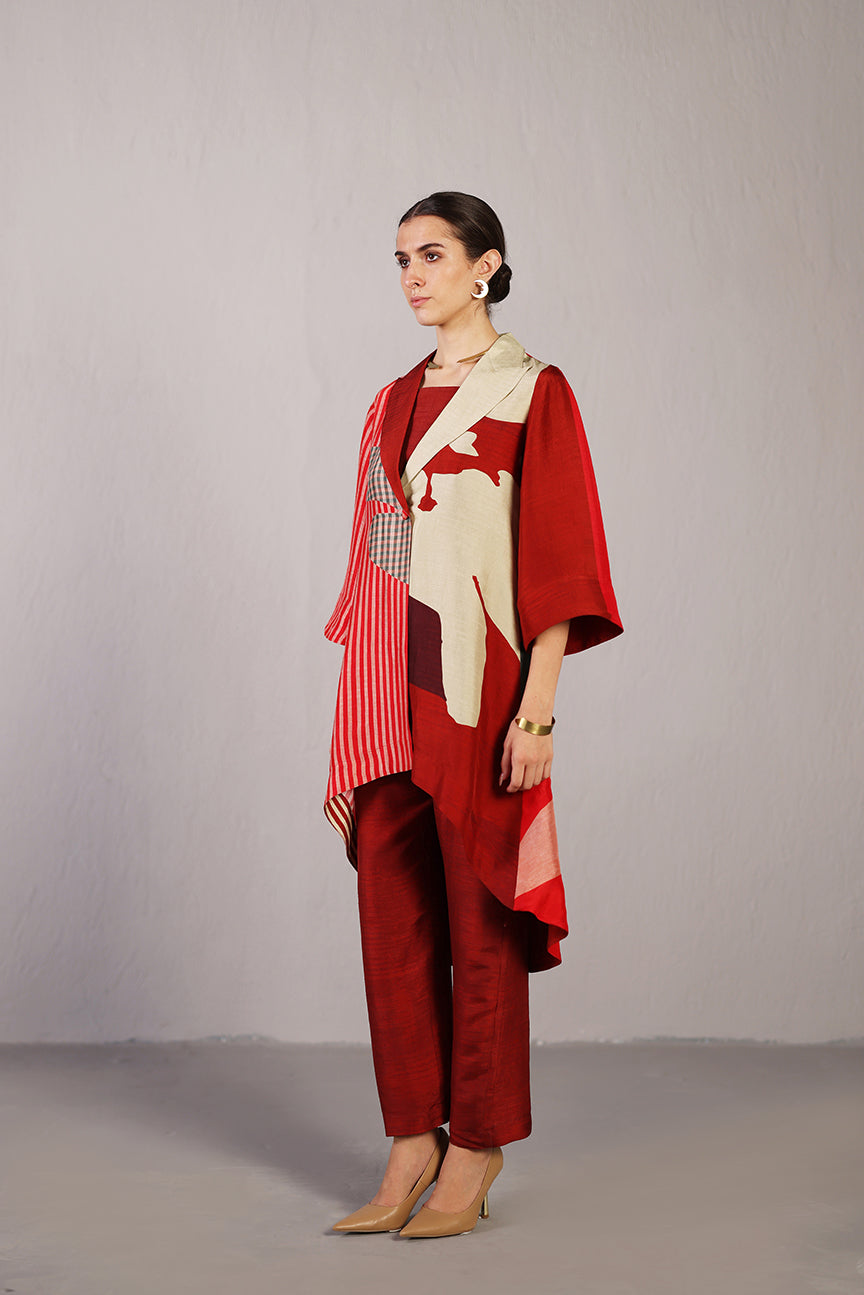 A crimson red co-ord set comprising of a long asymmetrical bright coloured jacket, a cut sleeve inner & straight pants curated in a soft silk fabric, designed in-house. Fabric - Dupion Silk Color -  Crimson Red     No. of Components - 3 Care - Dry Clean  Delivery - 21...