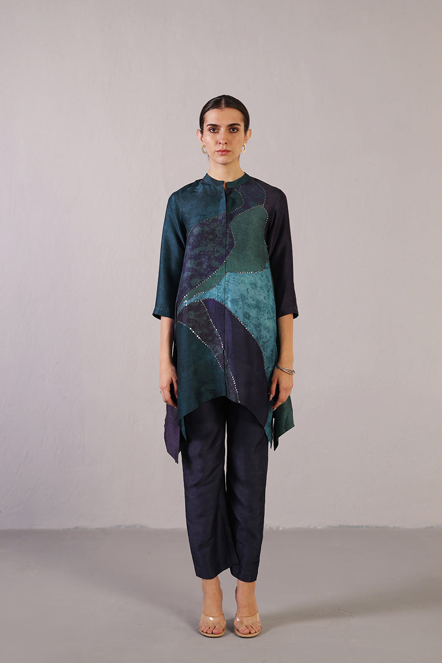 A blue shade kurta set with long sleeves & a round collar neck alongwith straight pants curated in a soft silk fabric designed in-house Fabric - Dupion Silk Color - Royal Blue No. of Components - 2 Care - Dry Clean  Delivery - 21 Days