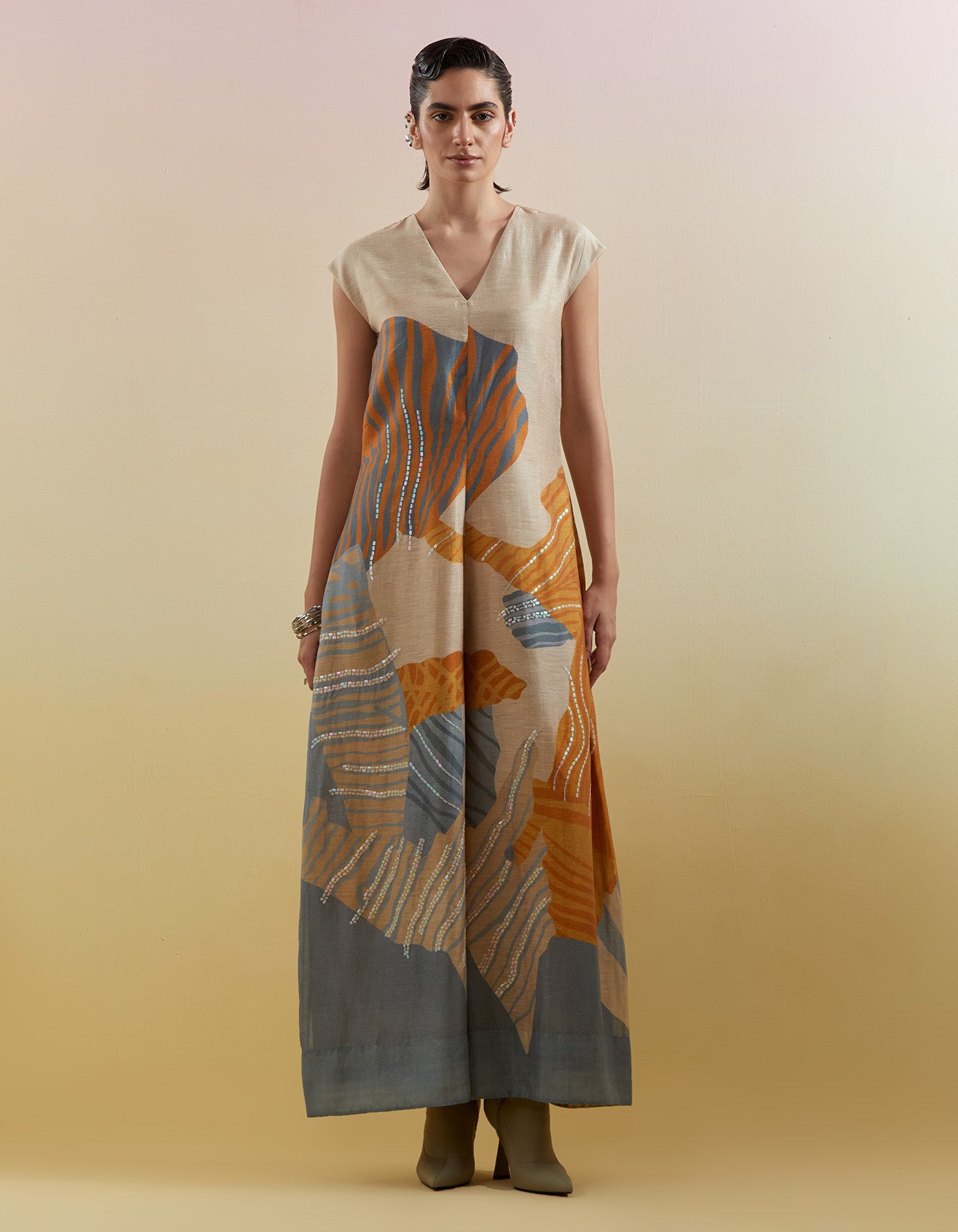 A beige and teal jumpsuit in linen silk, featuring a V-neckline with cap sleeves and wide-leg bottoms. Accented with the signature Flow print and embroidery embellishments, the silhouette is effortless yet refined. Fabric - Linen Silk Color - Beige & Teal No. of Components - 1 Care - • Avoid...