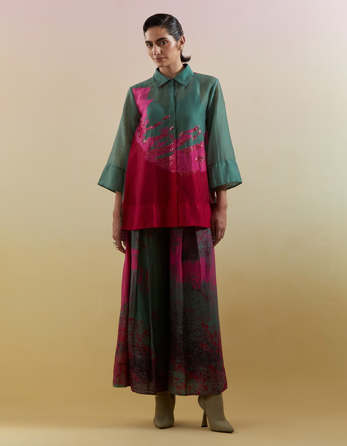 A pink and green co-ord set in linen silk, featuring a collared shirt with elbow-length sleeves paired with wide-leg trousers. Accented with the signature Flow print and embroidery embellishments, the set blends ease with statement appeal. Fabric - Shirt Linen Silk,  Pants- Linen Silk, Inner- Slub Cotton Color - Green...