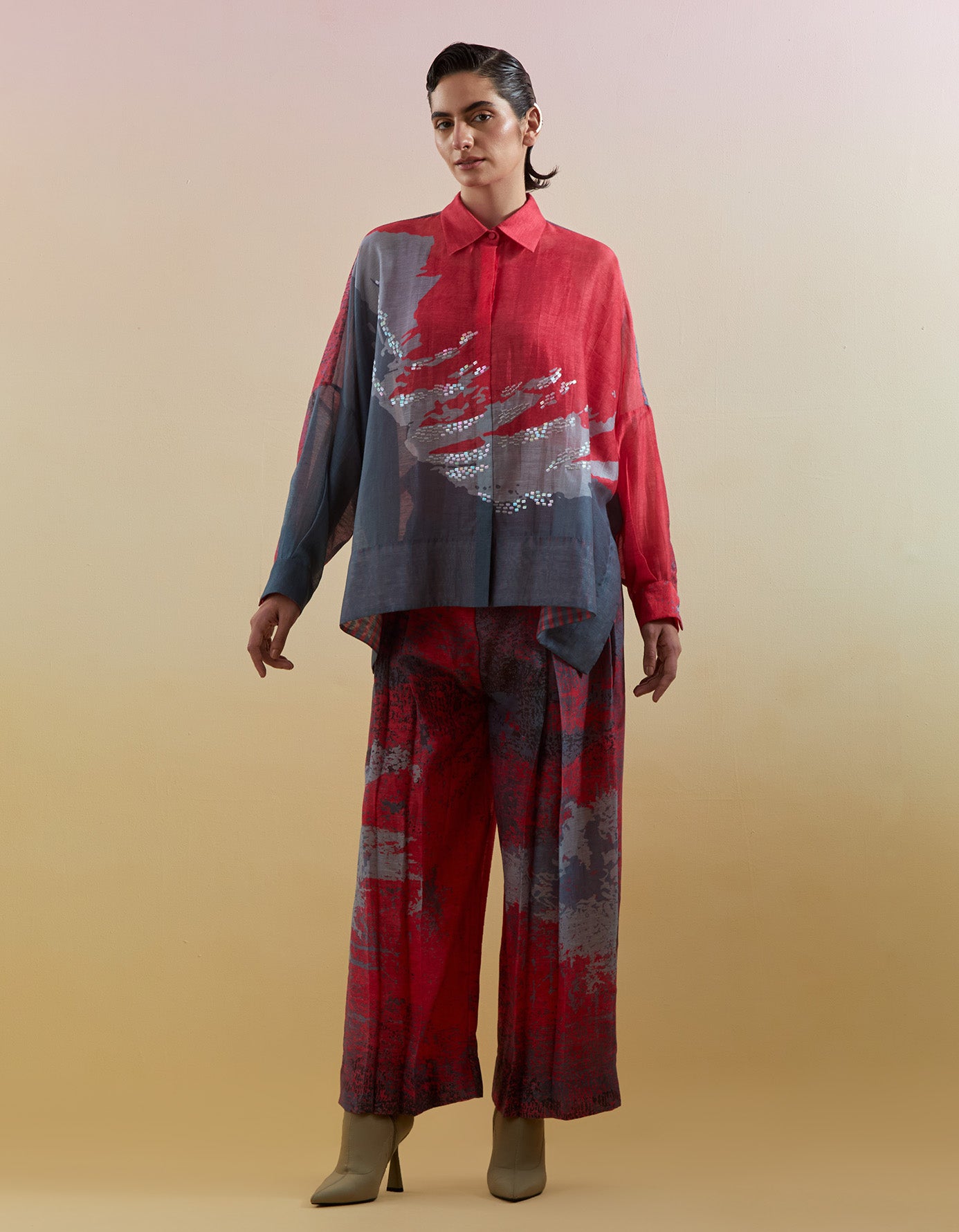 A pink and grey co-ord set in linen silk, featuring an oversized collared shirt with full sleeves paired with relaxed wide-leg trousers. Accented with the signature Flow print and embroidery embellishments, the set combines comfort with contemporary style. Fabric - Shirt- Linen Silk,  Pants- Linen Silk, Inner: Cotton Slub Color...