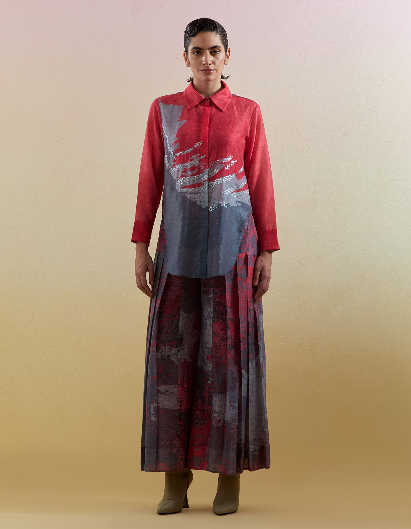 A pink and grey co-ord set in linen silk, featuring a collared full-sleeve shirt with the signature Flow print, paired with wide-leg pleated trousers in complementing tones. Detailed with embroidery embellishments, the set blends ease with sophistication. Fabric - Shirt- Linen Silk,  Pleated Pants- Linen Silk, Inner: Cotton Slub Color...