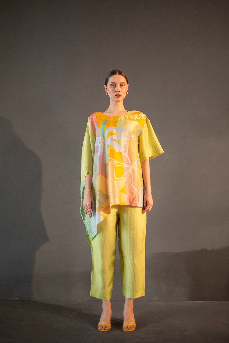 A two piece dupion silk set comprised of abstract geometric and floral print in playful color compositions and parallel pants with fusion textiles.