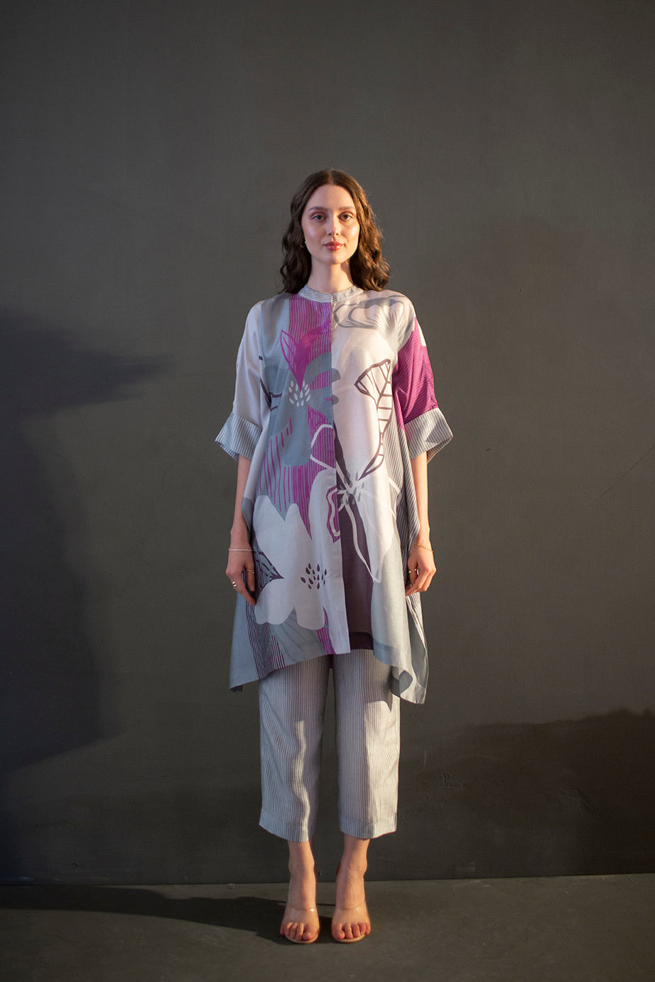 A two piece dupion silk set comprised of abstract geometric and floral print in playful color compositions and parallel pants with fusion textiles.