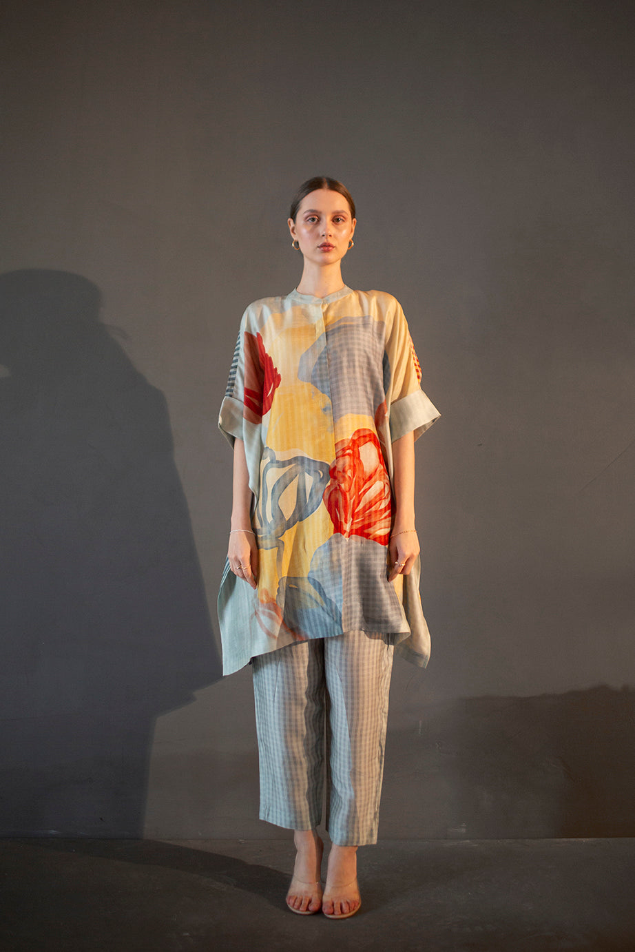 A two piece dupion silk set comprised of abstract geometric and floral print in playful color compositions and parallel pants with fusion textiles.