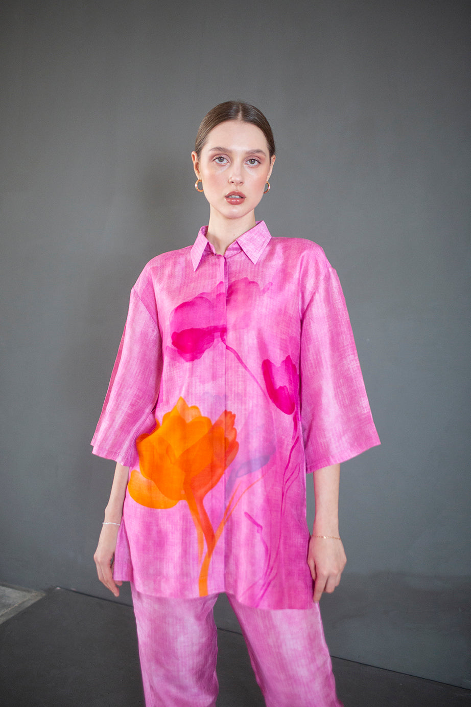 A two piece dupion silk set comprised of abstract geometric and floral print in playful color compositions and parallel pants with fusion textiles.