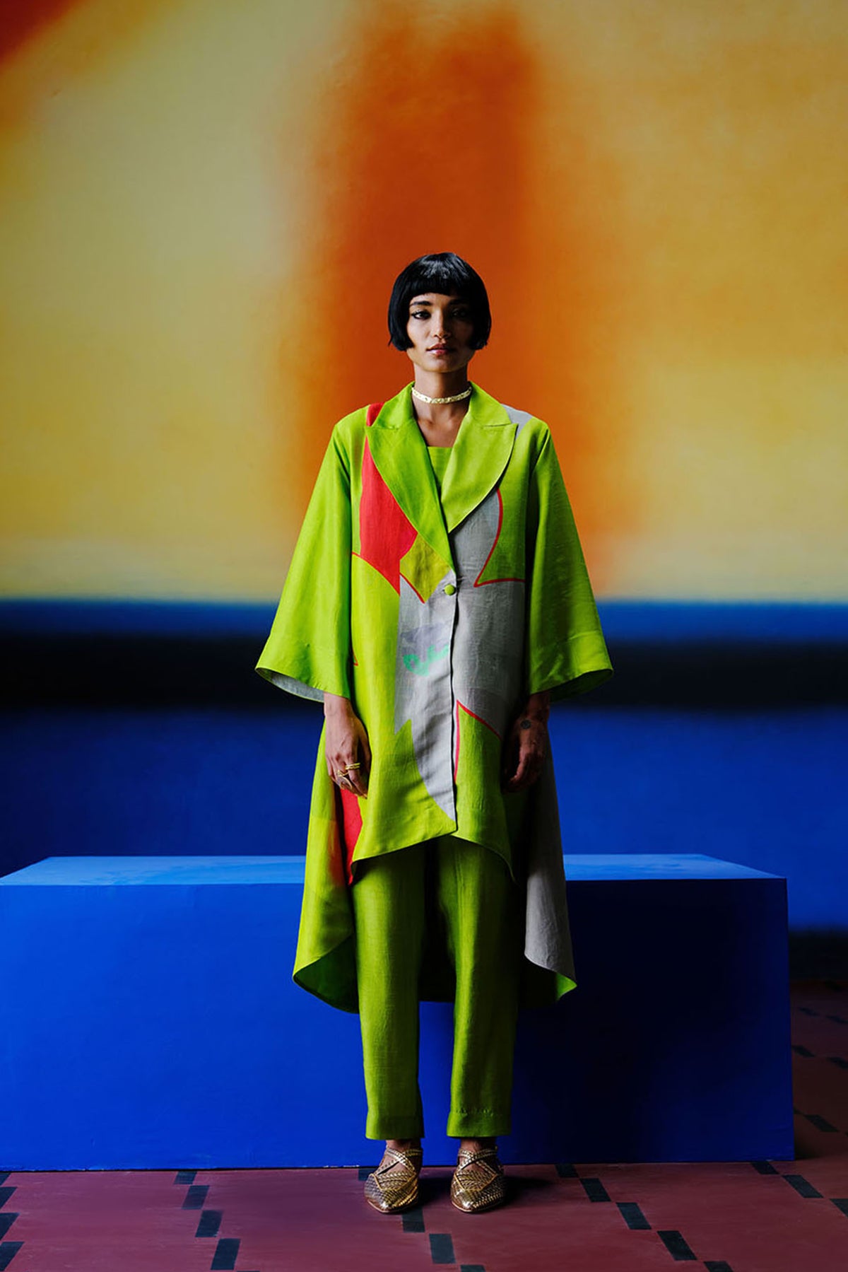 A lime green kurta set comprising of a long asymmetrical bright coloured jacket, a cut sleeve inner & straight pants curated in premium silk fabric with a painterly application of colour, designed in-house. Fabric - Dupion Silk Color -  Lime Green No. of Components - 3 Care - Dry Clean ...