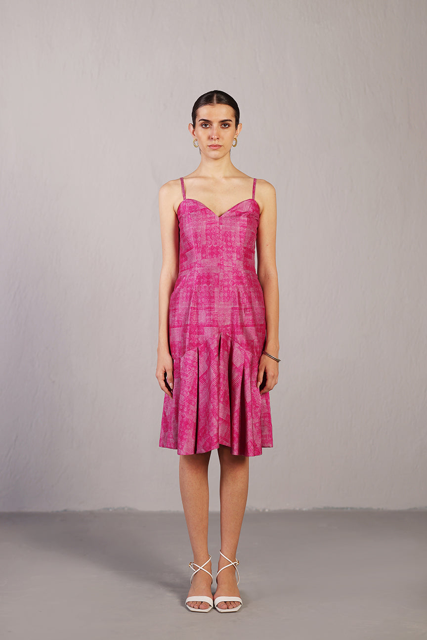 A magenta pink dress with strappy sleeves, fitted till the hip & loose pleated flare downwards, curated in a soft silk fabric designed in-house. Fabric - Dupion Silk Color - Magenta Pink No. of Components - 1 Care - Dry Clean  Delivery - 21 Days