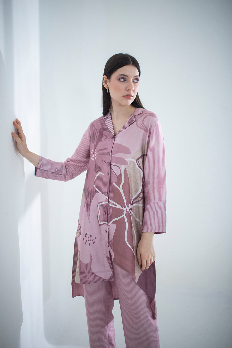 A two piece dupion silk set comprised of abstract geometric and floral print in playful color compositions and parallel pants with fusion textiles.