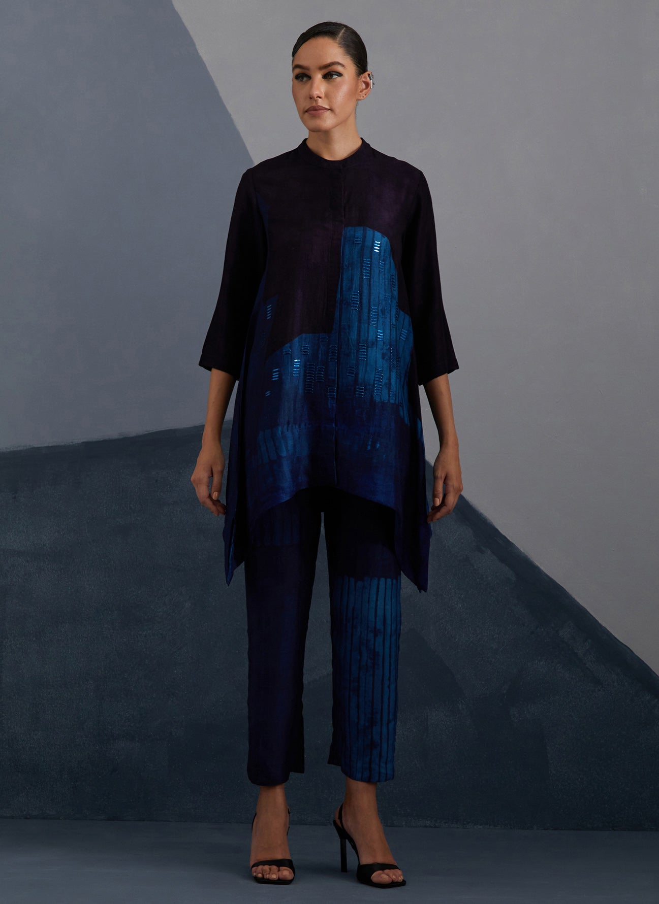 An ink and sapphire set in Dupion Silk, featuring a relaxed-fit tunic with a band collar and a sharp, pointed asymmetrical hemline. Accented with the signature omen print and embellishments, paired with straight trousers for a confident, modern finish.  " Fabric -  Shirt -Dupion Silk, Pant -Dupion Silk Color -...