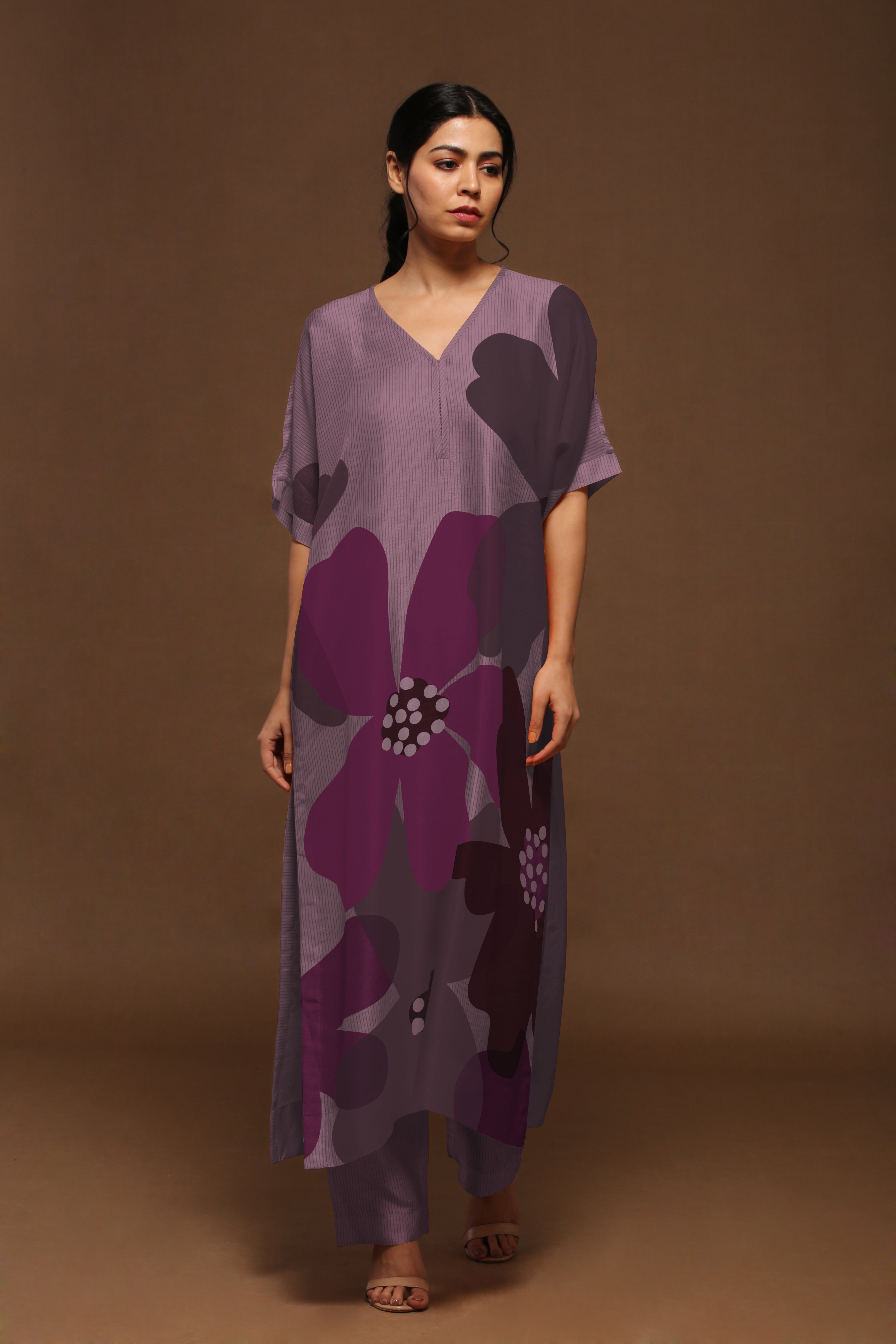 Textile Colour Variation of a two piece rich dupion silk set comprised of the V neck flat piping detail long kurta and parallels with fusion textile floral play.