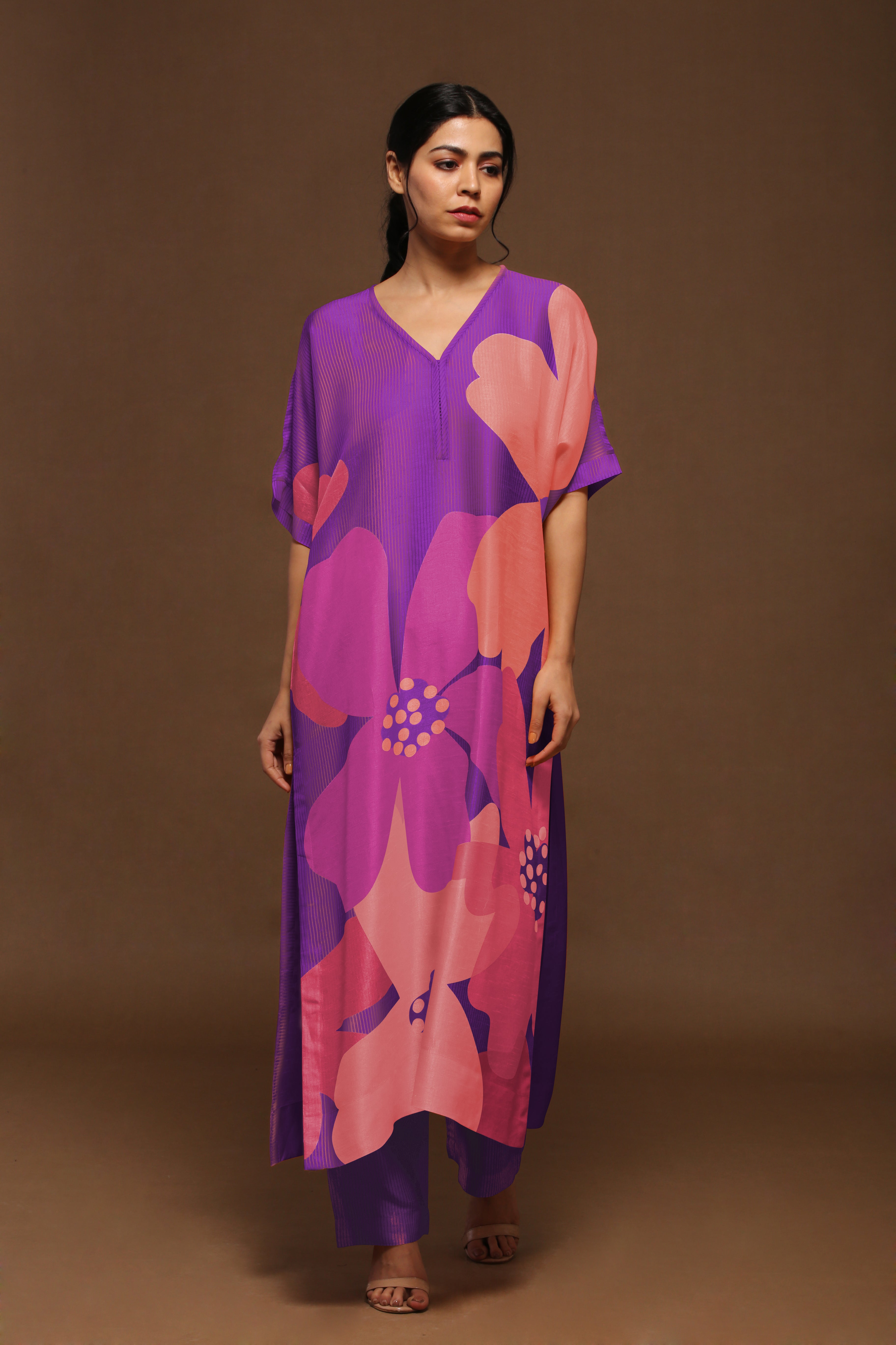 Textile Colour Variation of a two piece rich dupion silk set comprised of the V neck flat piping detail long kurta and parallels with fusion textile floral play.