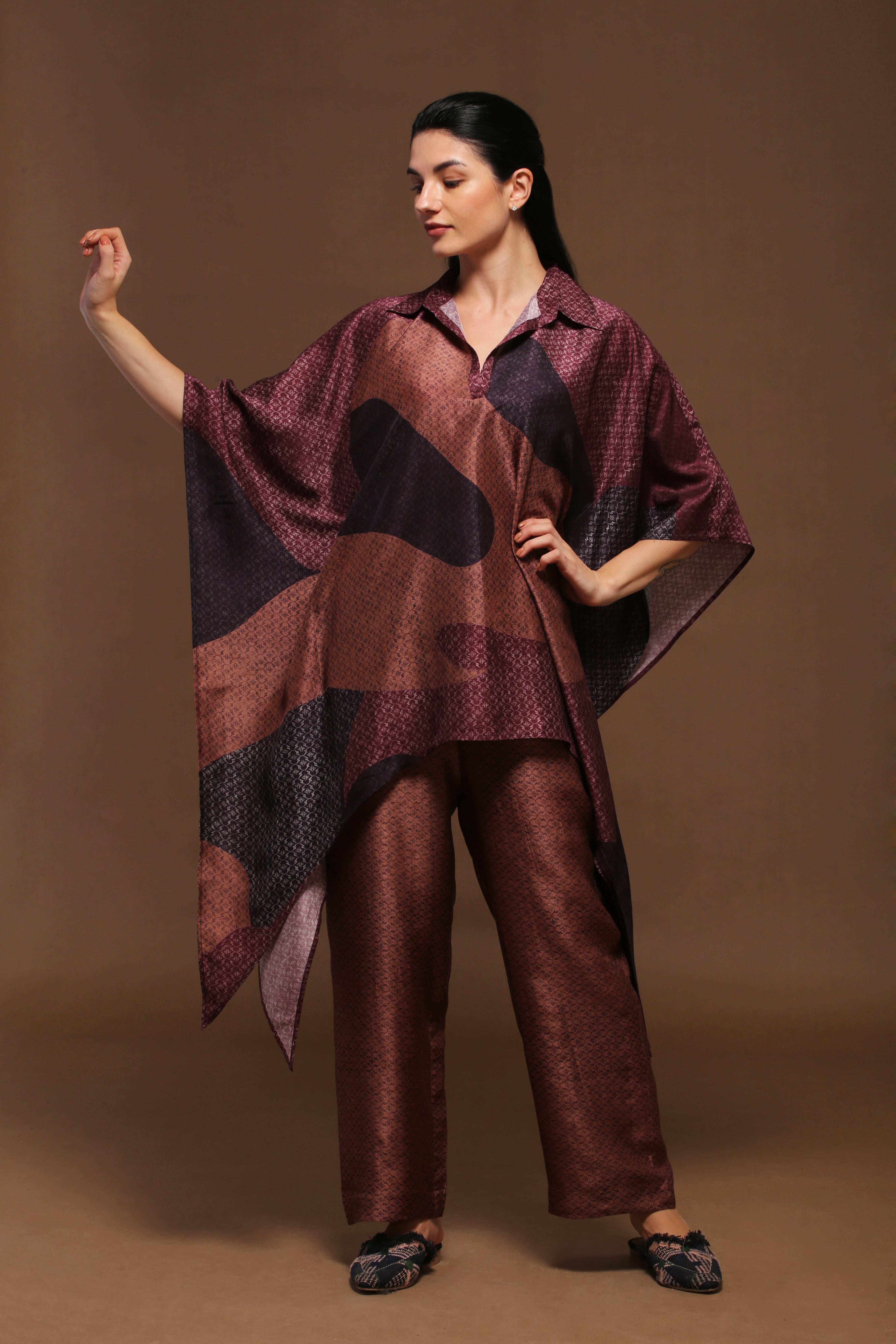 A two piece rich dupion silk set comprised of a collar detail kaftaan tunic and parellel pants with fusion textile play of geometric patterns and waves.
