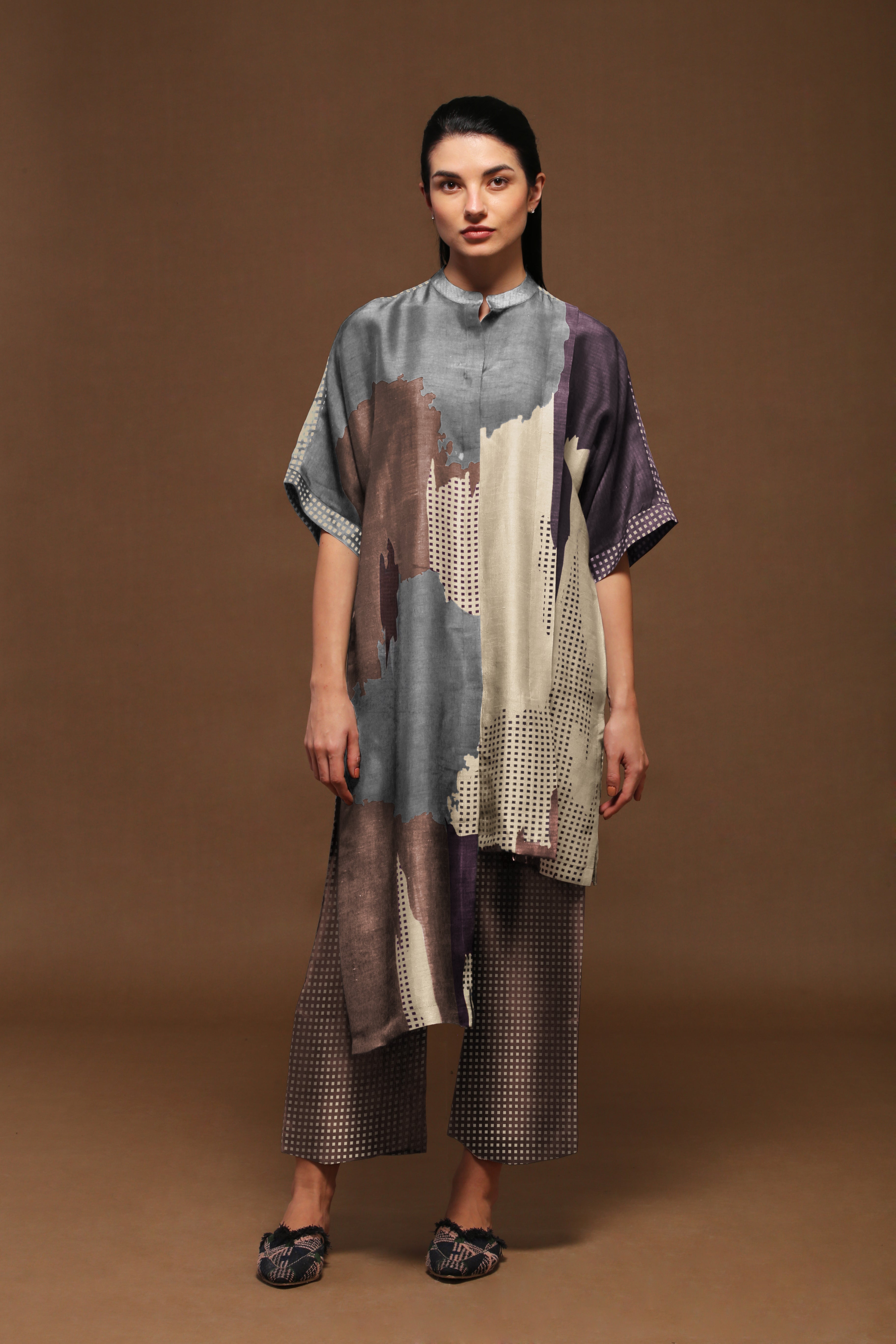 Textile Variation of a two piece rich dupion silk set comprised of the V neck flat piping detail long kurta and parallels.