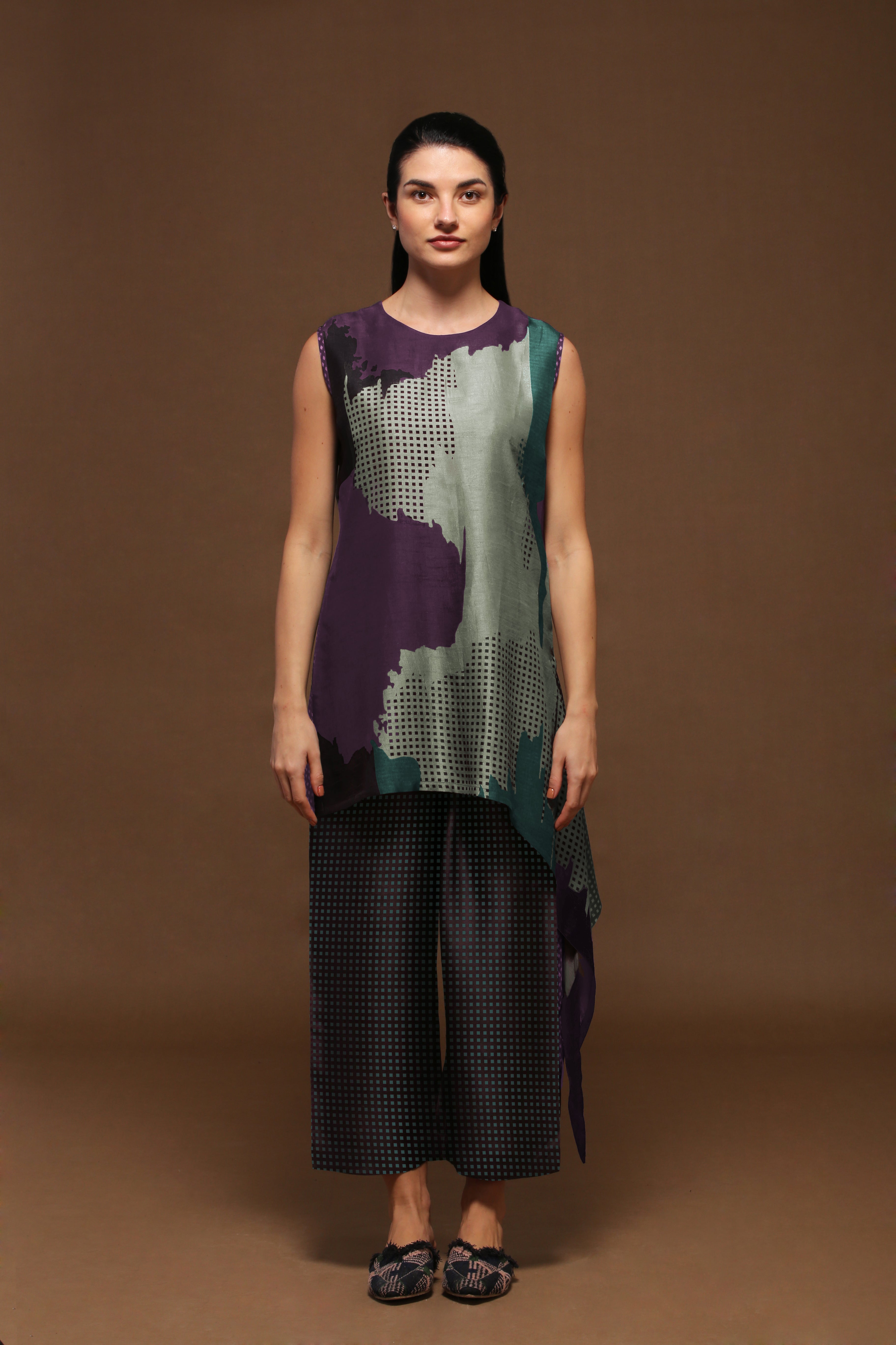 Textile Variation of a two piece rich dupion silk set comprised of the V neck flat piping detail long kurta and parallels.