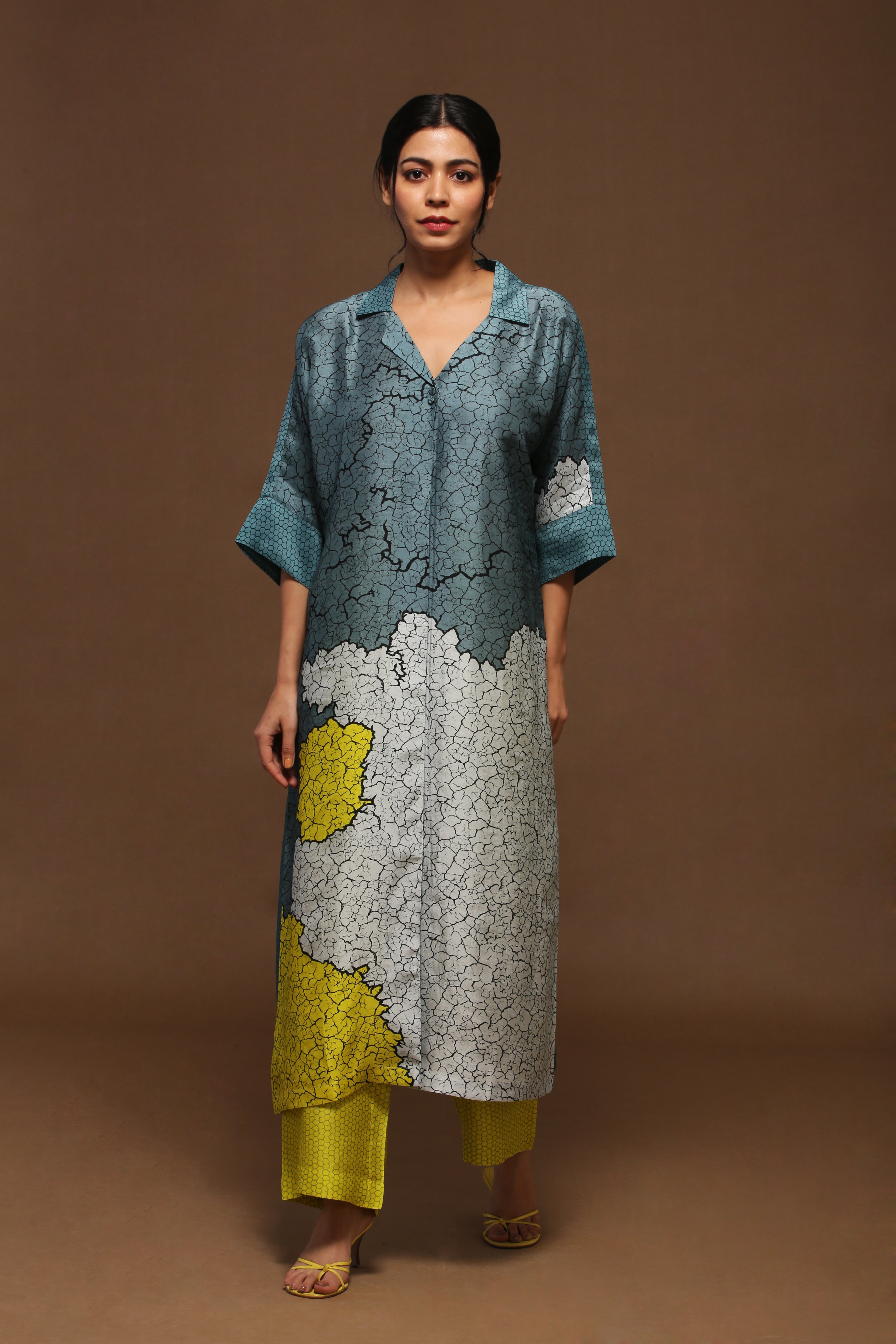 Textile variation of Half collar aesthetic detail Long Kurta and parallel Bottom in Dupion Silk.