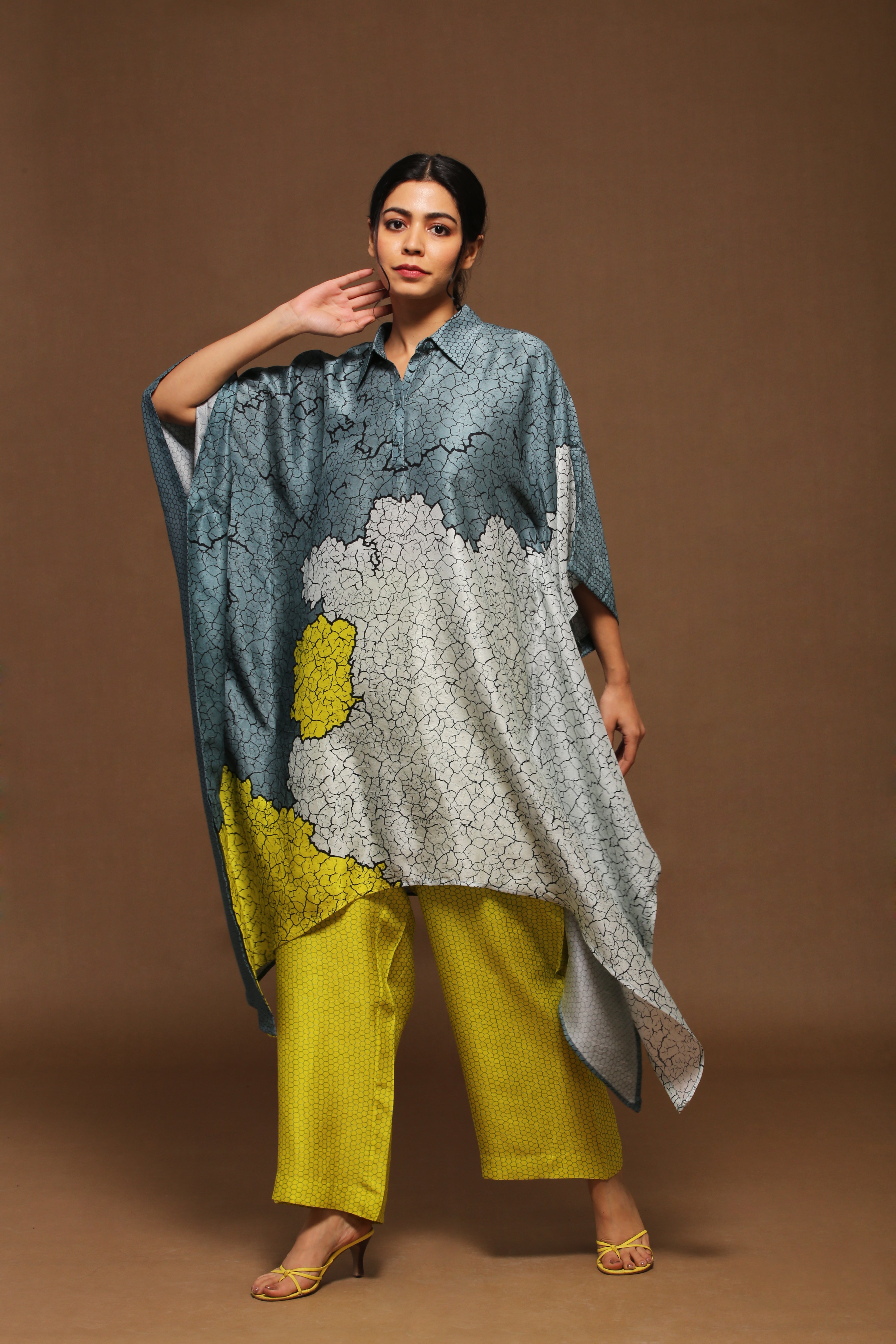 A two piece rich dupion silk set comprised of a collar kaftaan and parallels crafted on an avant-garde textile print.