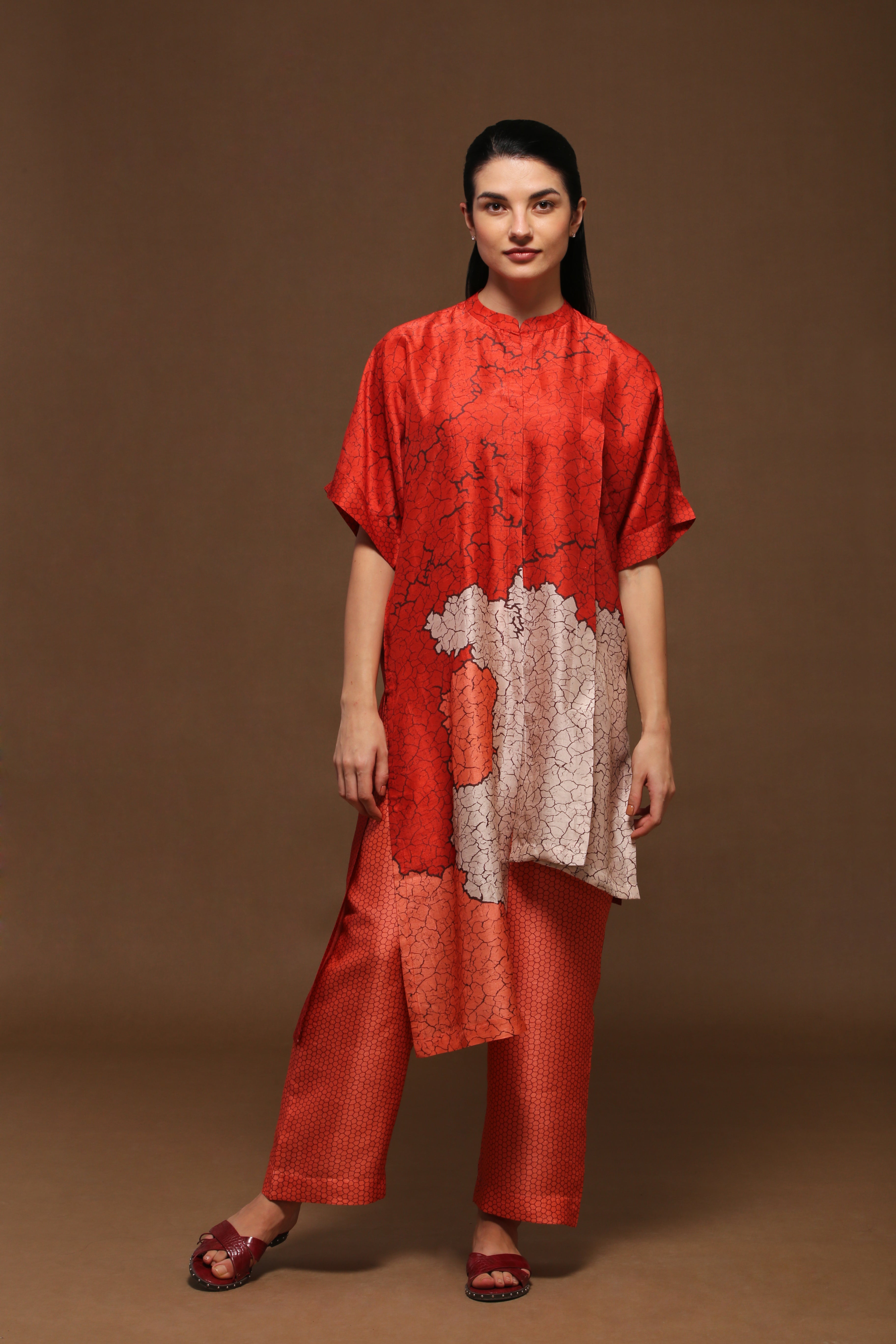 Textile Print Variation of A two piece rich dupion silk set comprised of the double pleats detail madarin collar tunic and parellel pants.