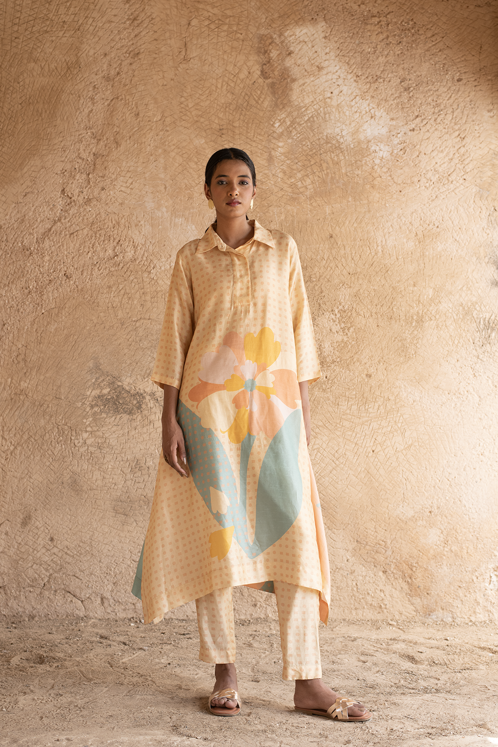 A two piece rich dupion silk set comprised of a standard collared kurta with A -line details designed in-house.