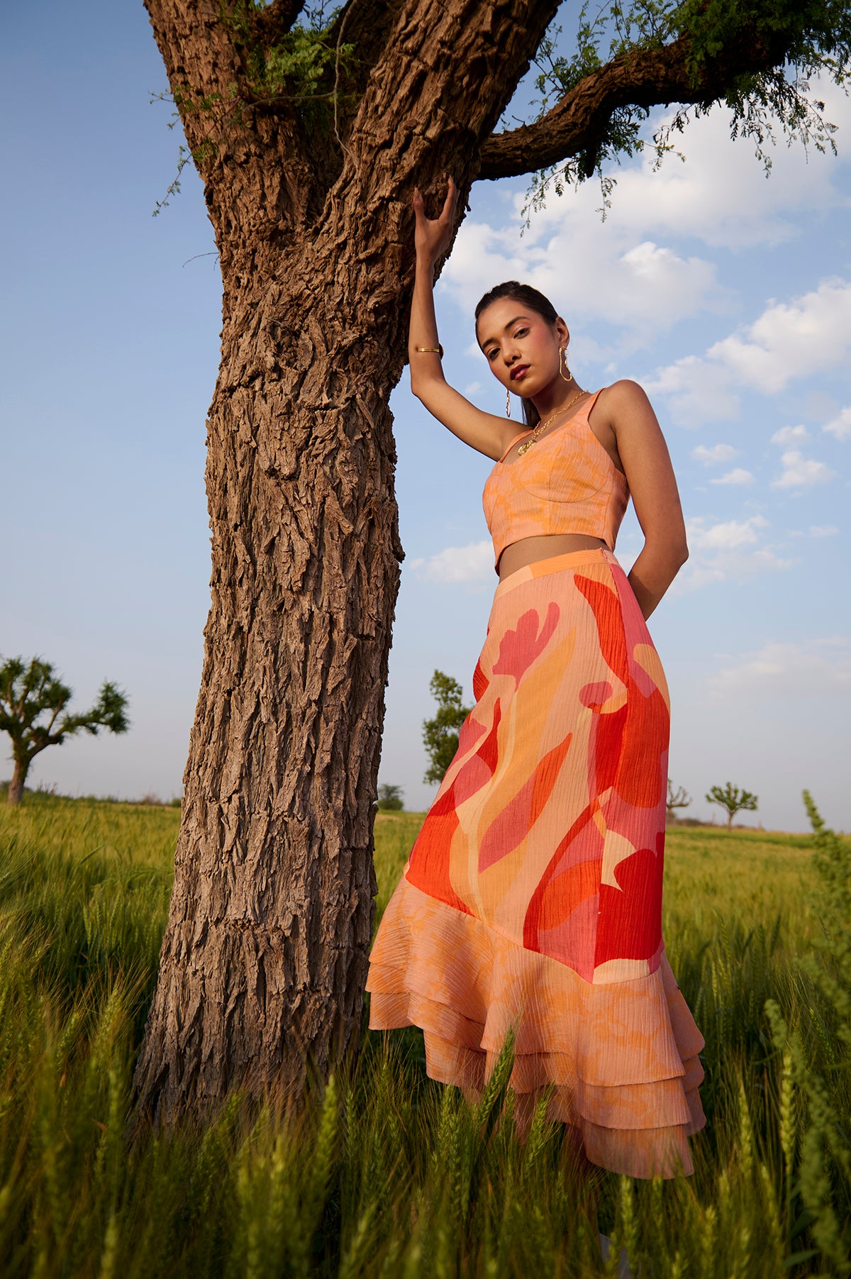 A bustier with straight frilled skirt in abstract prints designed in-house in plant based Japanese fabric