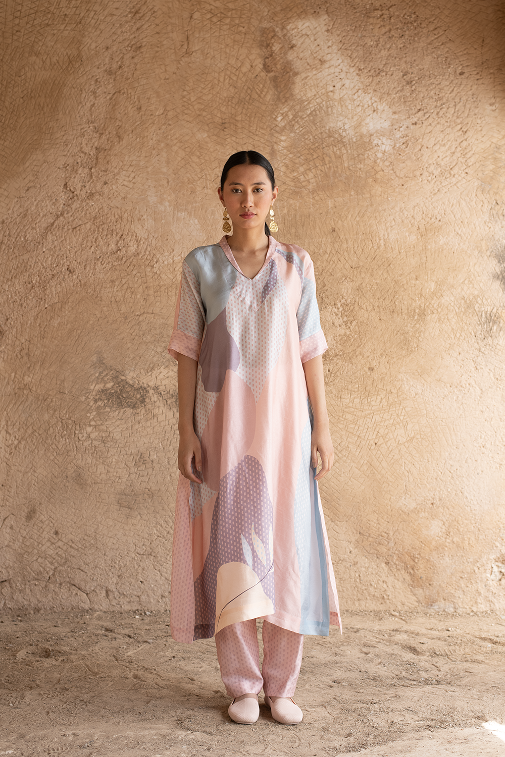A two piece straight kurta set with high low pattern & collared - shirt made in rich dupion fabric.